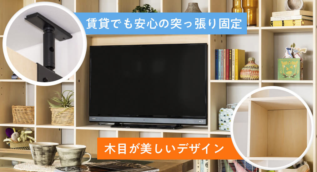 65インチまでの大型テレビも余裕をもって設置できる広々設計で、リビングにおすすめのこのタイプの「突っ張り壁面収納OSAMARU」では、更におしゃれな使い方が出来るんです。