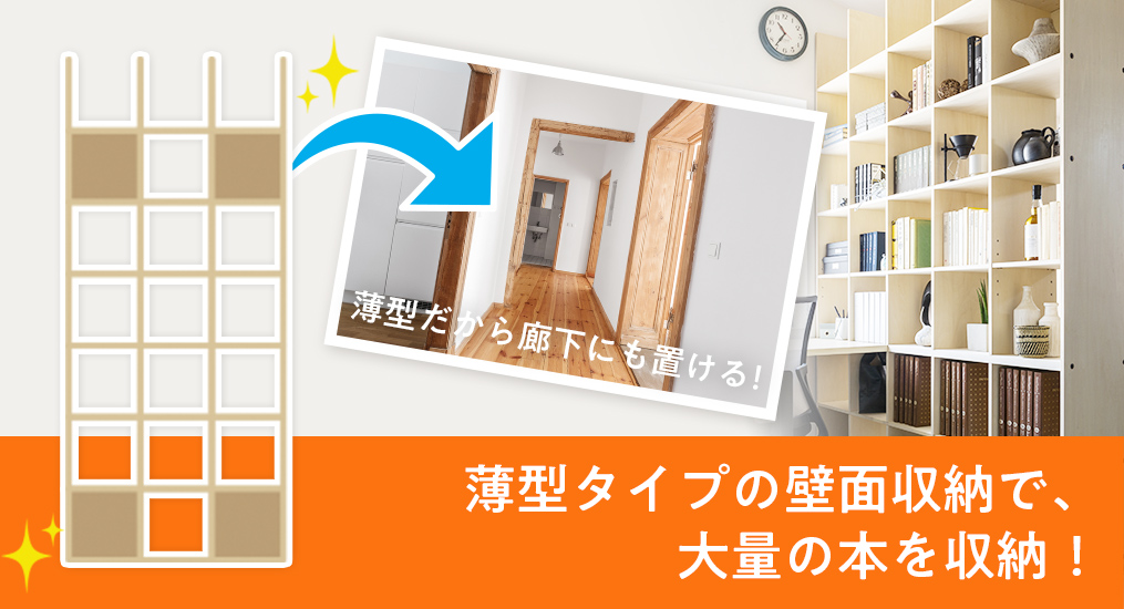 サイズ選べる薄型の壁面収納本棚で大量の蔵書も高効率に収納!