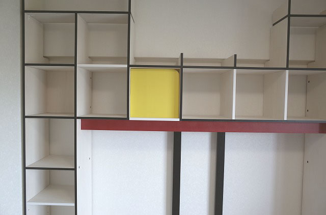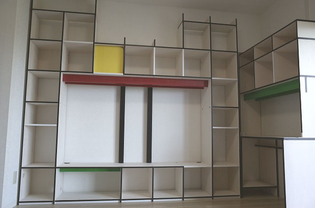 なんとなくモンドリアン風になってきたので、木口を黒色のテープで処理し、