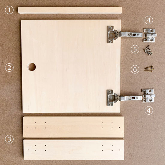 ③ タテ枠(穴の開いた木製パーツ) × 2本 ④ スライド丁番(受座) × 2個