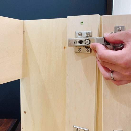 「④スライド丁番(受座)」を「⑤ネジ(短)」を使って取り付けていきます。