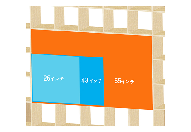 テレビ開口部は26・43インチ・65インチの3サイズからお選びいただけるので、ご家庭のテレビに合った商品を選ぶことができます。