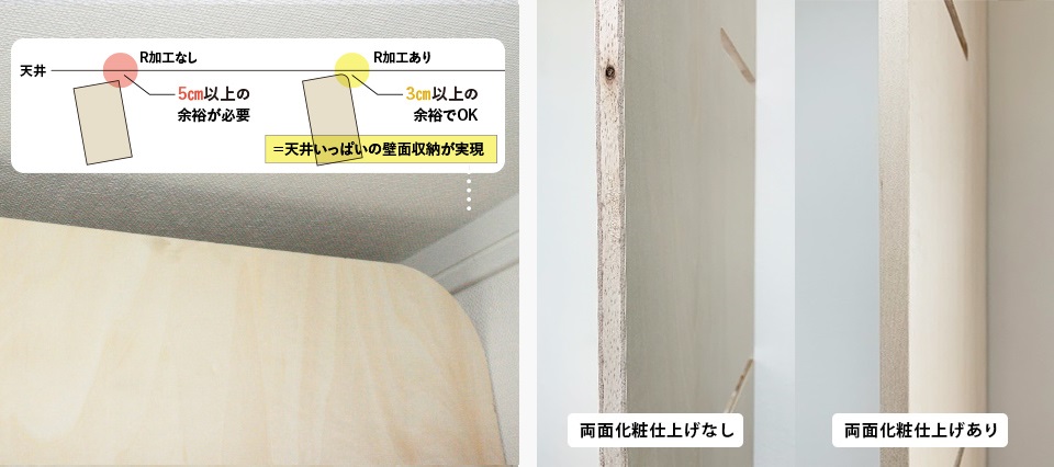 収納の一番上の段を好みの高さにカットする、デスク天板の横幅のカット天井ギリギリに設置したい場合の「R加工」や、通常の壁面に向く面の「化粧仕上げ」「転倒防止アジャスター」を利用することで、より強力に固定、「開梱設置サービス」でスムーズな設置