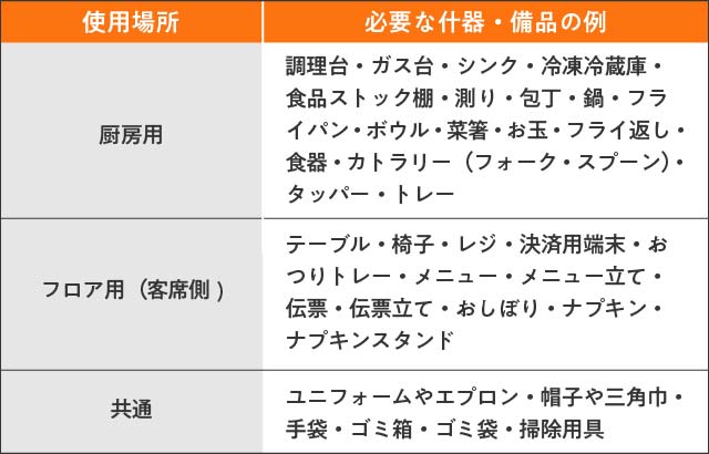 飲食店で揃える基本的な什器・備品を表にしました。