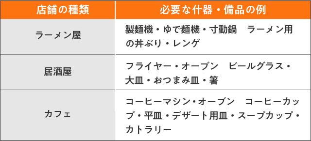 ここではお店の種類によって異なる什器・備品の例を表にしました。