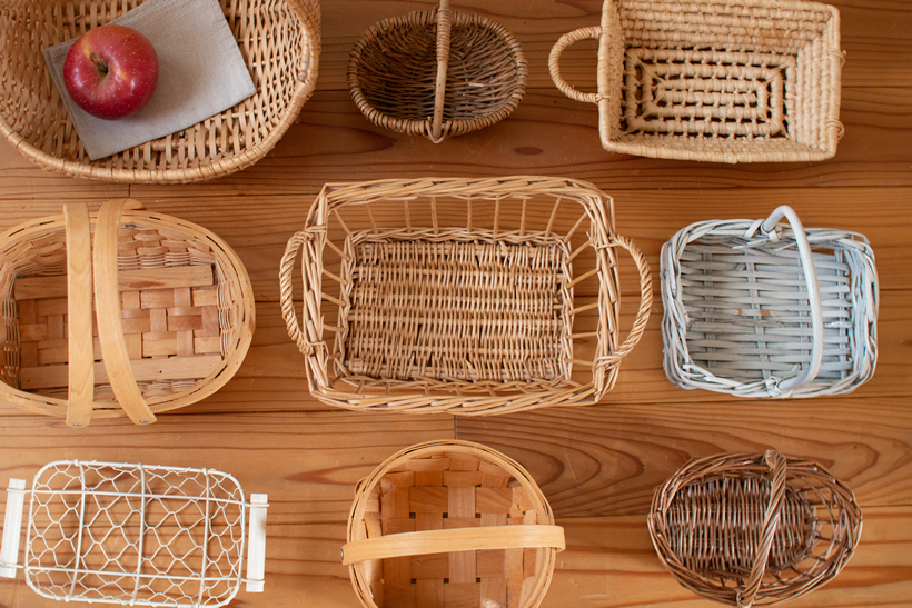 小物類や日用品、部屋の雰囲気に合わない色味のアイテムは、自然素材の籠や木の箱などを利用して収納しましょう。