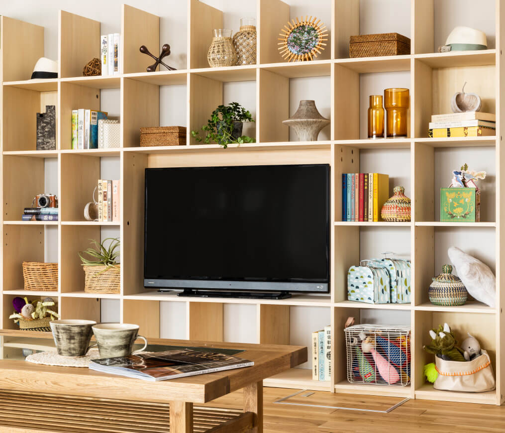 最大サイズの開口部(タテ3×ヨコ5コマ)は65インチの大型テレビ対応サイズで、リビングがさながらミニシアターに早変わり。