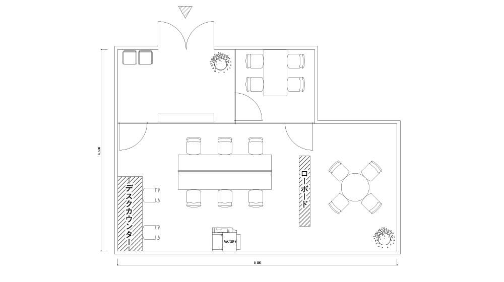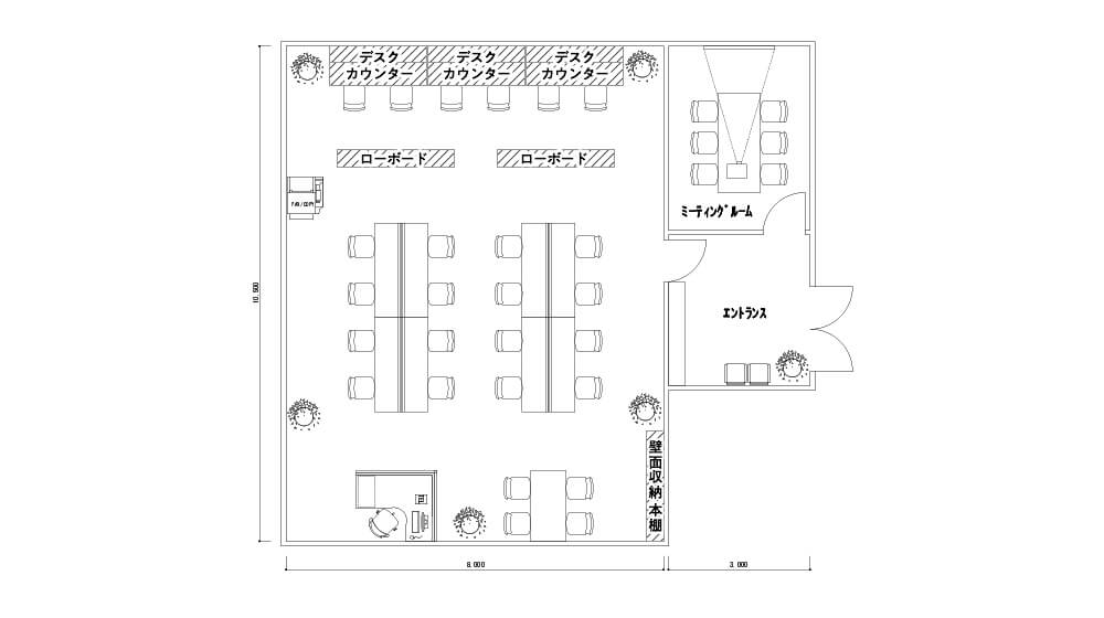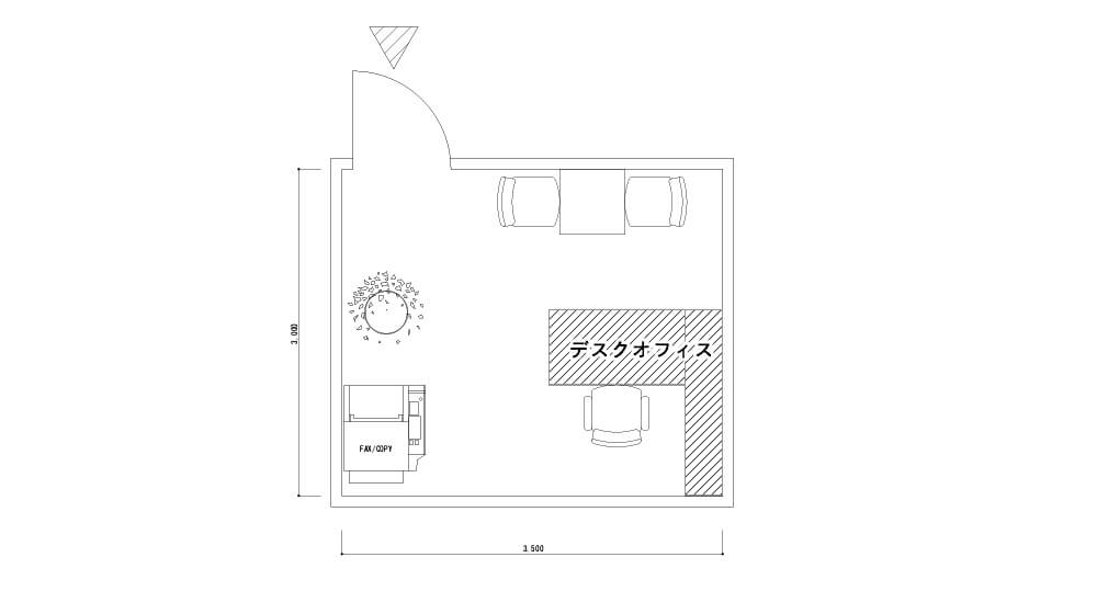 社長と信頼できるスタッフの構成の会社なら、チームとしての一体感を出すために、大きく仕切りすぎずに空間のセンターを開けて、デスクで作業しながらでも会話ができる距離感のレイアウトにしたいものです。 壁側に一面にレイアウトした壁面収納なら、収納の問題はすべてそこで解決して、残ったセンタースペースを密なコミュニケーションが可能なデスクレイアウトにできます。