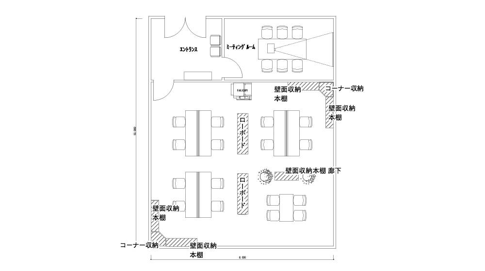 オフィスのレイアウトは、造作で作り込んでしまうとなかなか変えることができませんが、壁面収納をベースに、壁側の天井いっぱいの収納や、好きな位置にパーティションとしてスペース同士の間に配置して行くと、造作なしで収納量も担保された、自由度の高いオフィスができあがります。その後の移動も、楽に行うことができます。