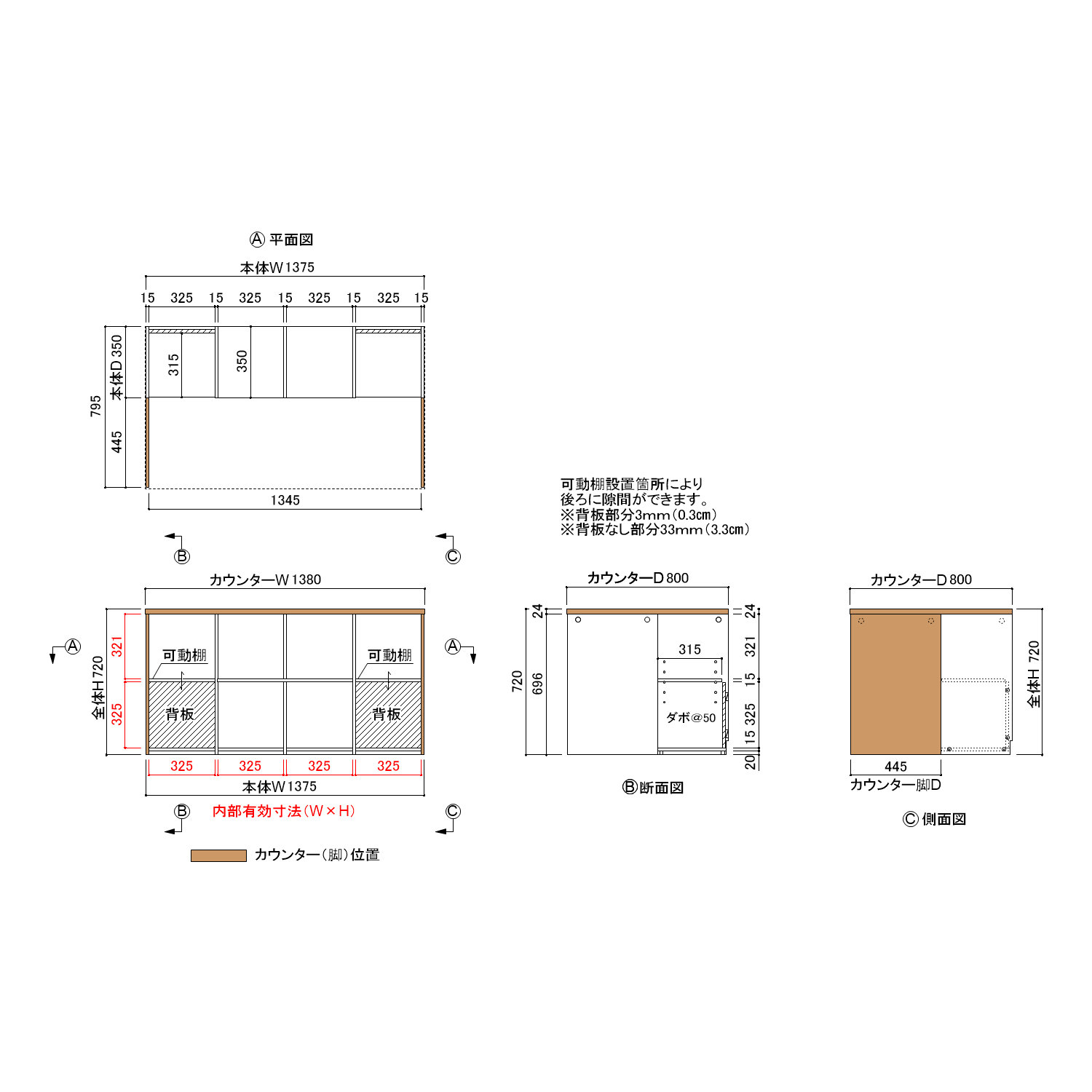 本体:W1375×H696×D350 カウンター:W1380×D800×T24 |
