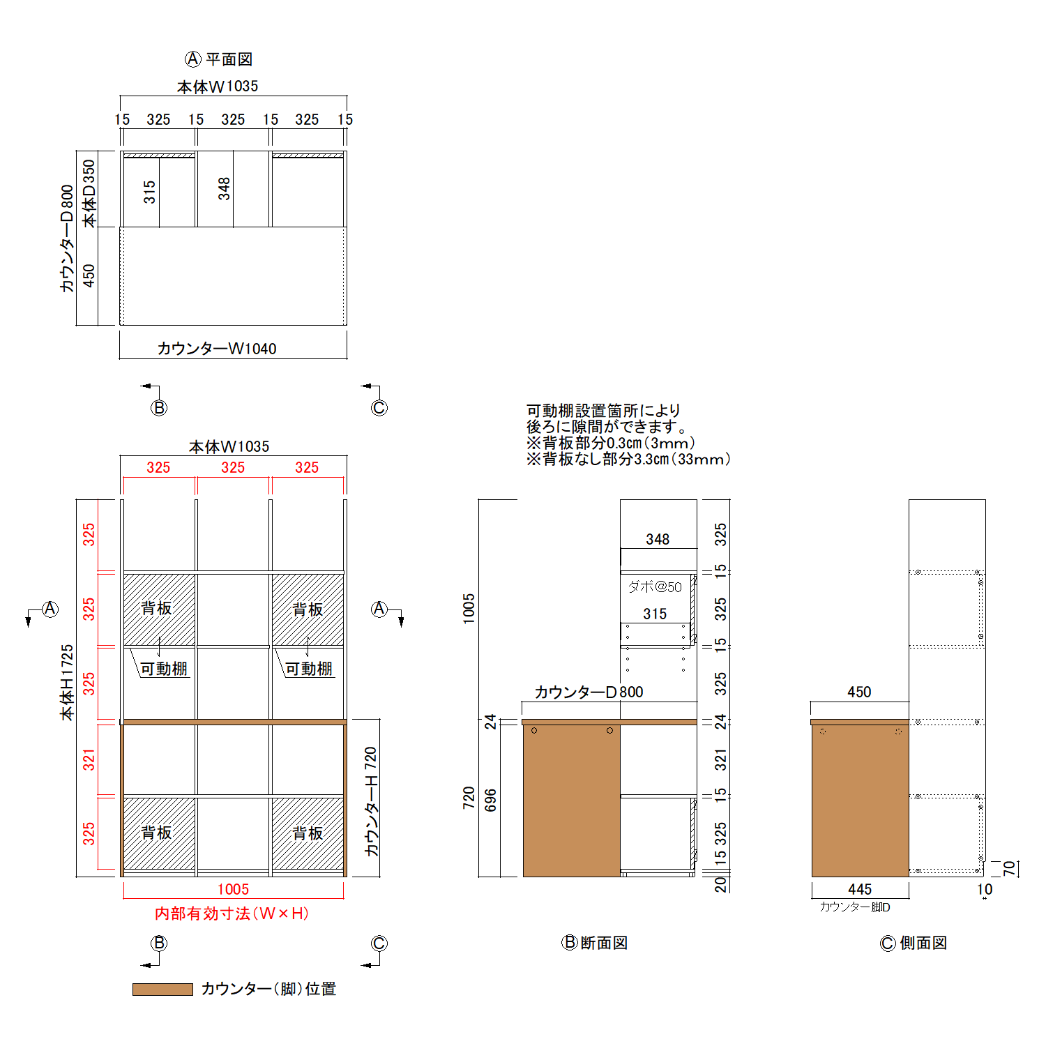 本体:W1035×H1725×D350 カウンター:W1040×D800×T24 |