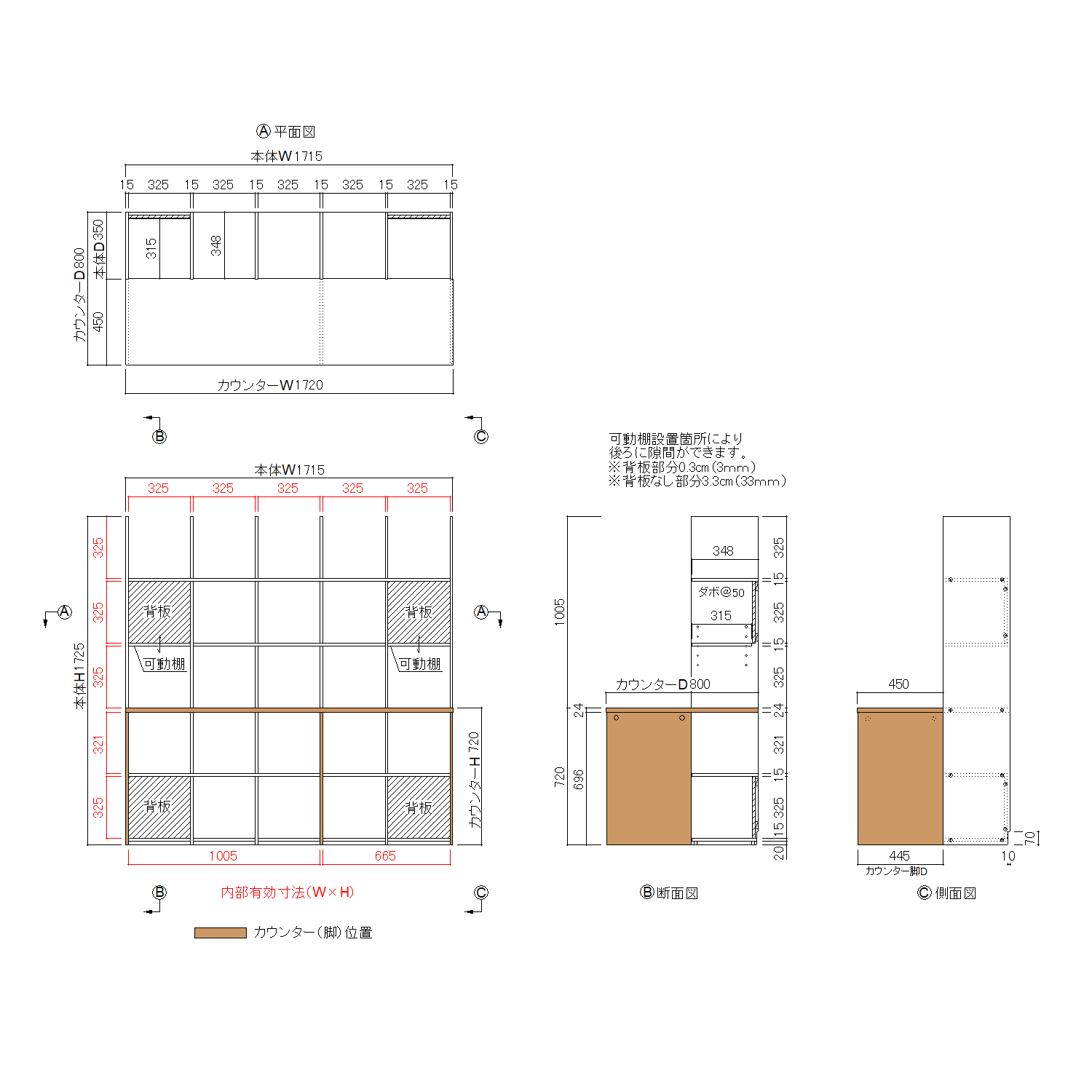 本体:W1715×H1725×D350 カウンター:W1720×D800×T24 |