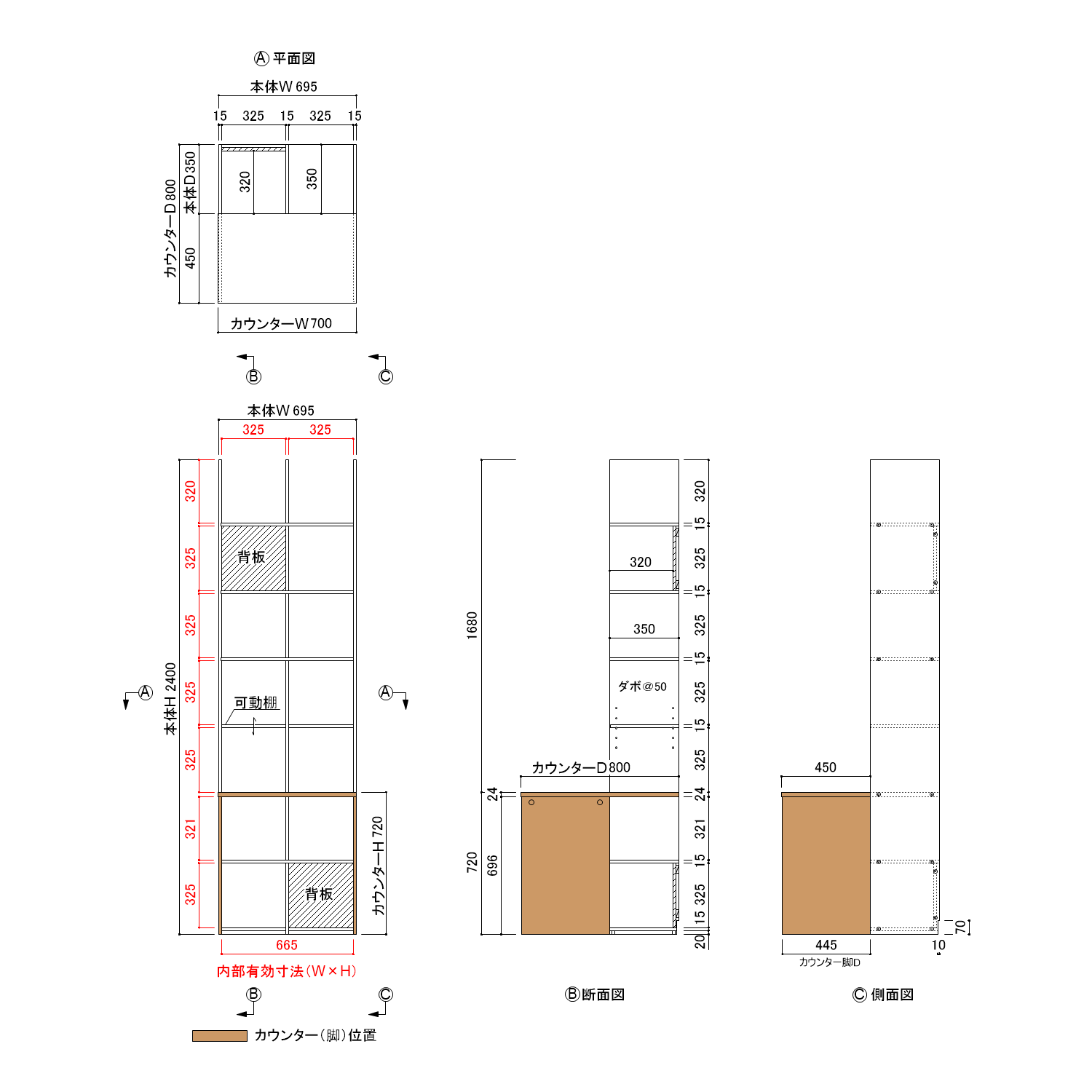 本体:W695×H2400×D350 カウンター:W700×D800×T24 |