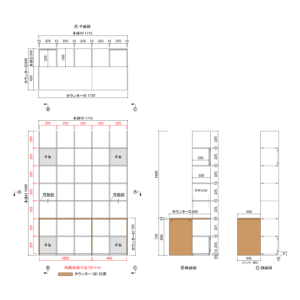 | 付属品 | 六角レンチ・側板ジョイント金物(JCB)GB・カウンター連結金具・木ダボ・ダボ棚受・転倒防止用金具 |