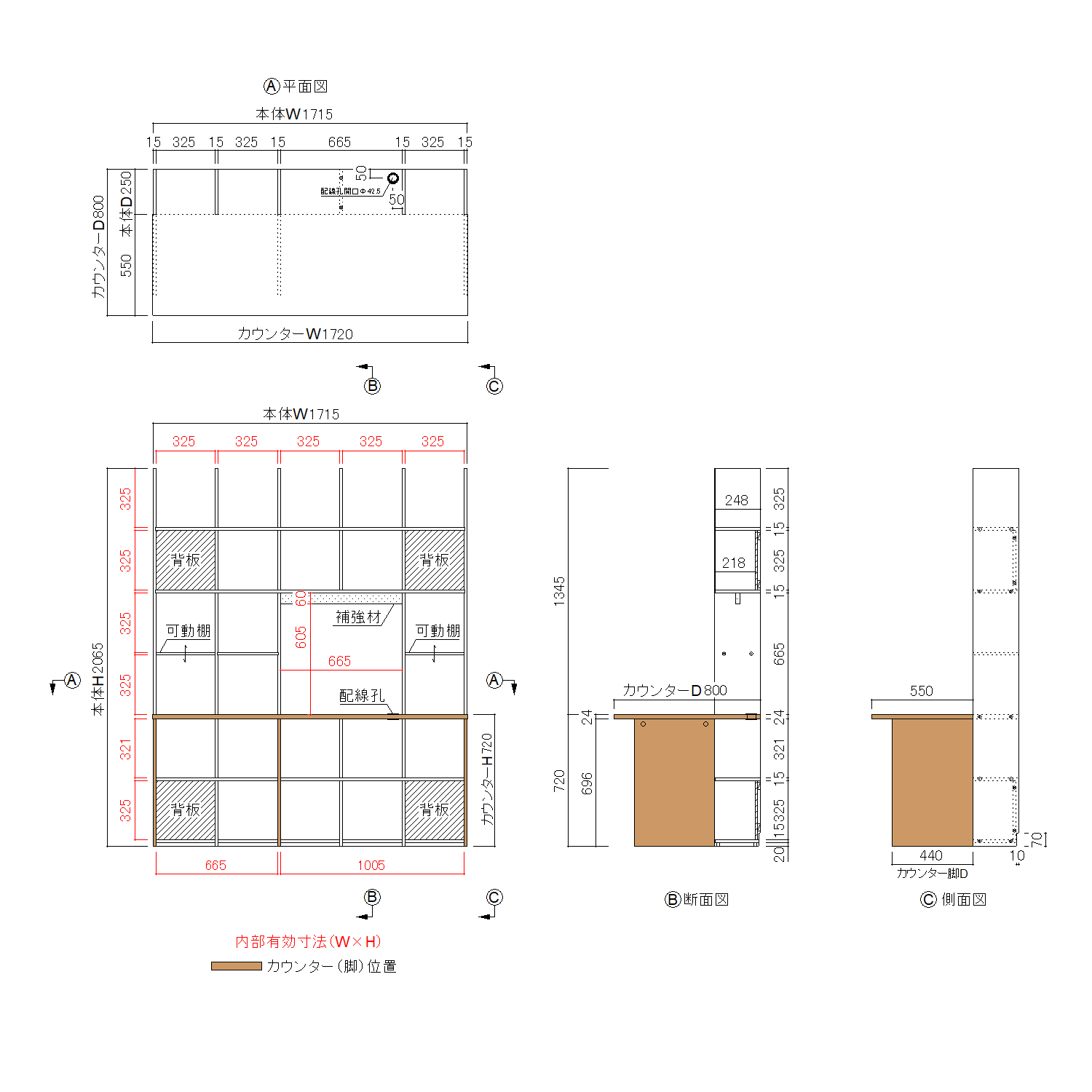 | サイズ | 全体:W1720×H2065×D800 本体:W1715×H1725×D250 カウンター:W1720×D800×T24 |