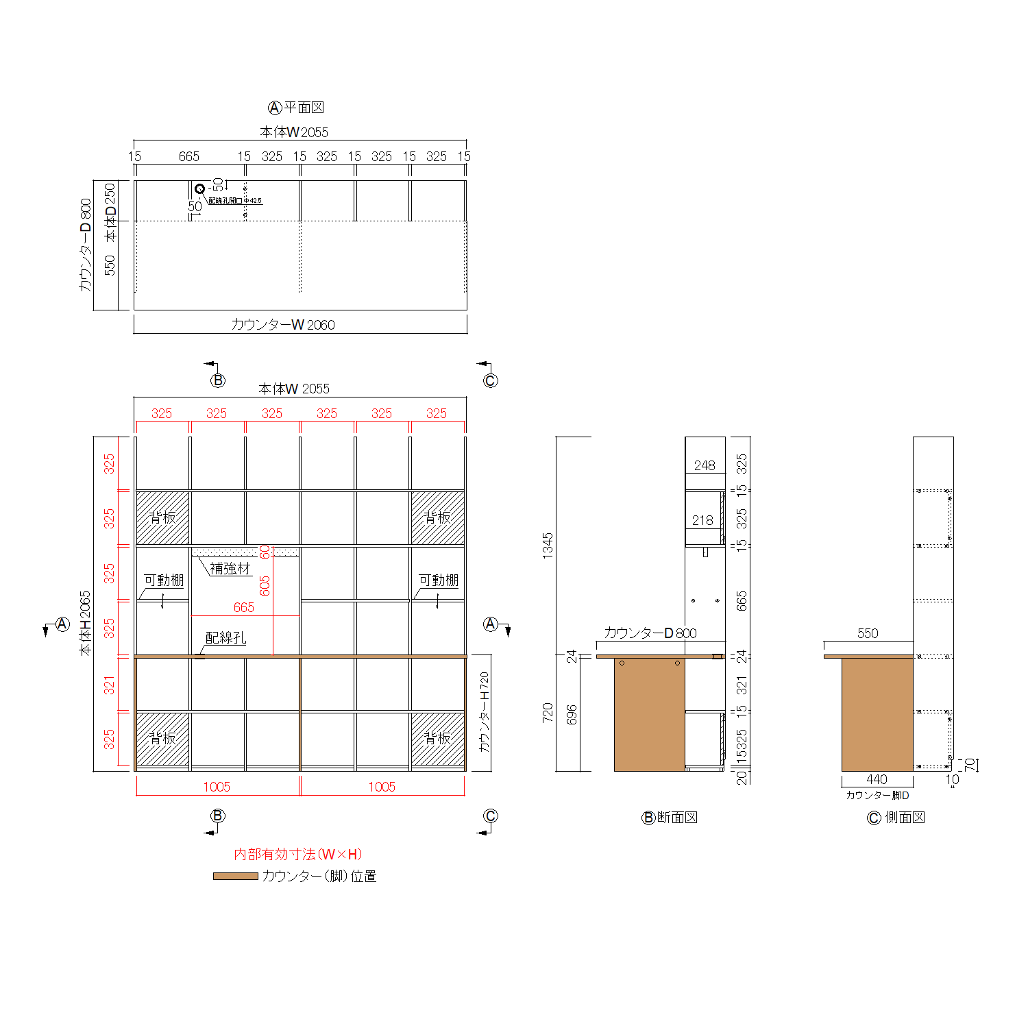 | サイズ | 全体:W2060×H2065×D800 本体:W2055×H1725×D250 カウンター:W2060×D800×T24 |