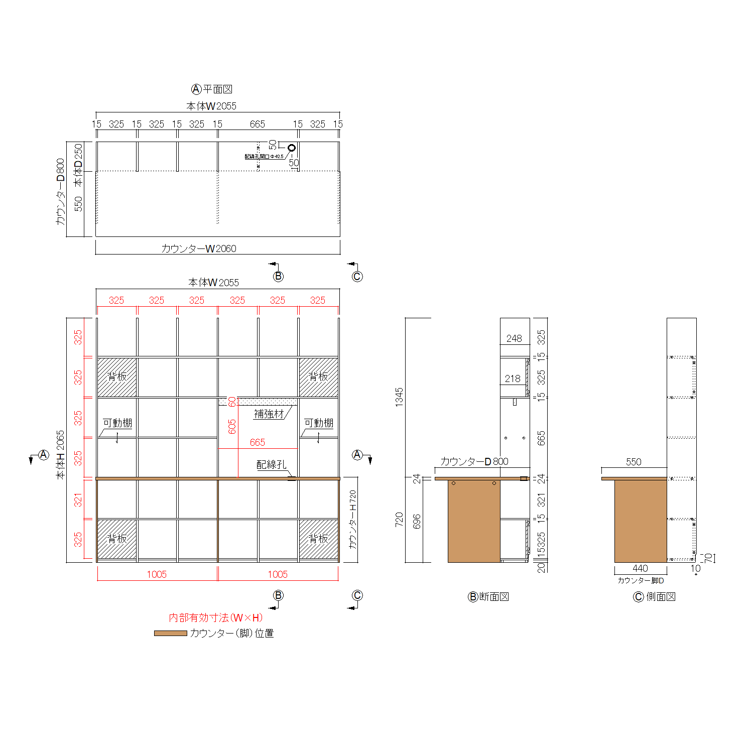 | サイズ | 全体:W2060×H2065×D800 本体:W2055×H1725×D250 カウンター:W2060×D800×T24 |