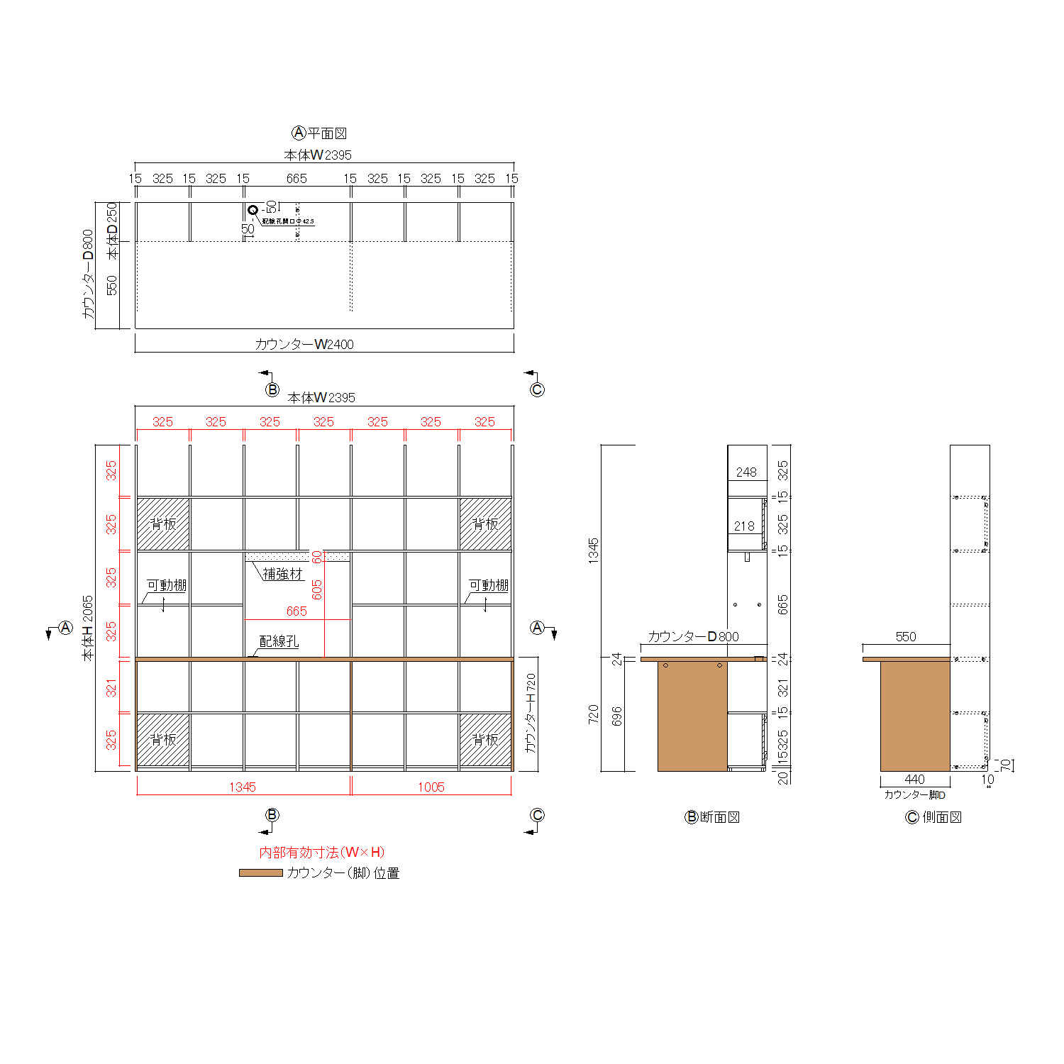 | サイズ | 全体:W2400×H2065×D800 本体:W2395×H1725×D250 カウンター:W2400×D800×T24 |