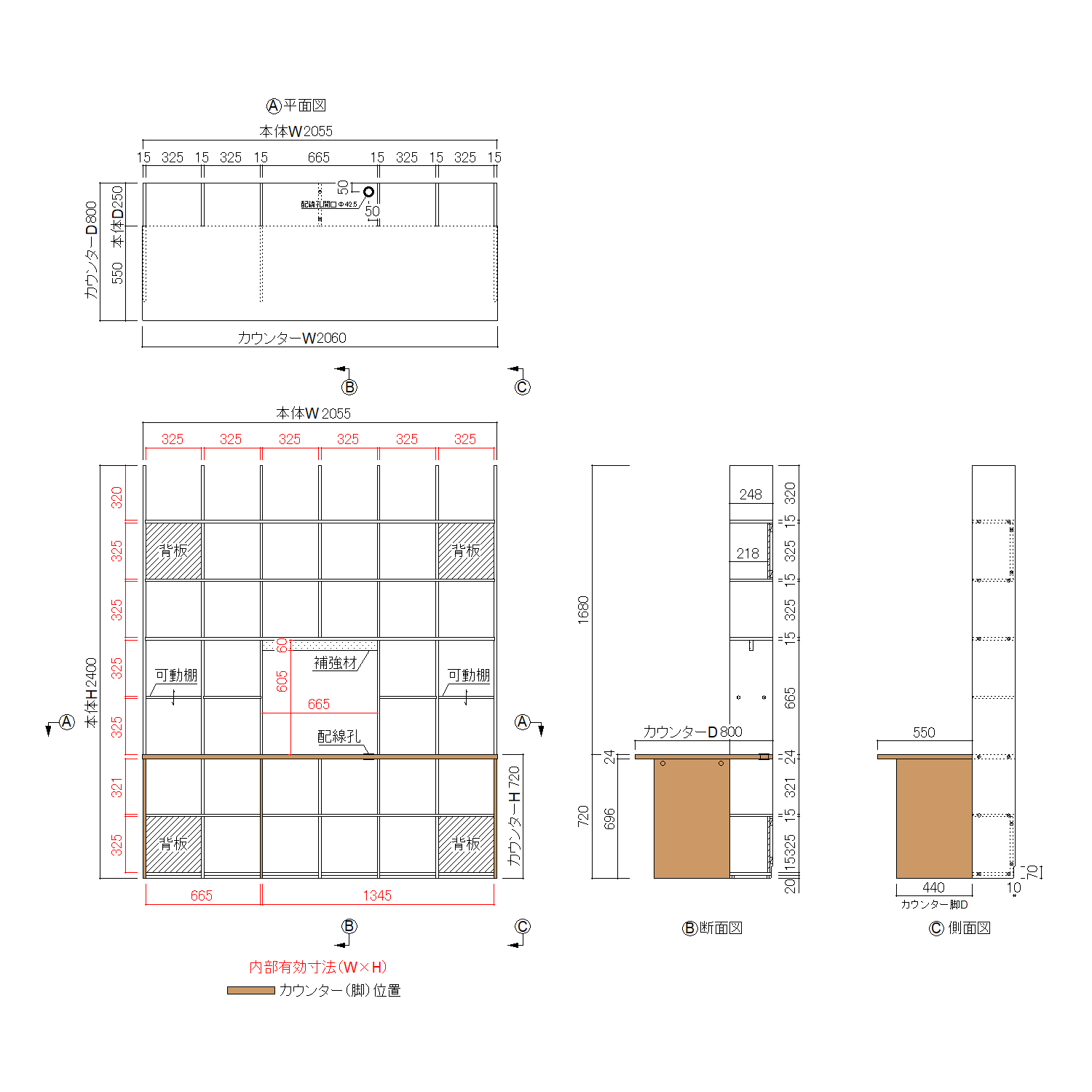 | サイズ | 全体:W2060×H2400×D800 本体:W2055×H2400×D250 カウンター:W2060×D800×T24 |