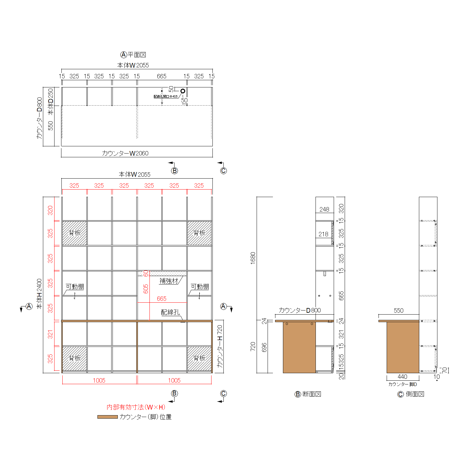 | サイズ | 全体:W2060×H2400×D800 本体:W2055×H2400×D250 カウンター:W2060×D800×T24 |