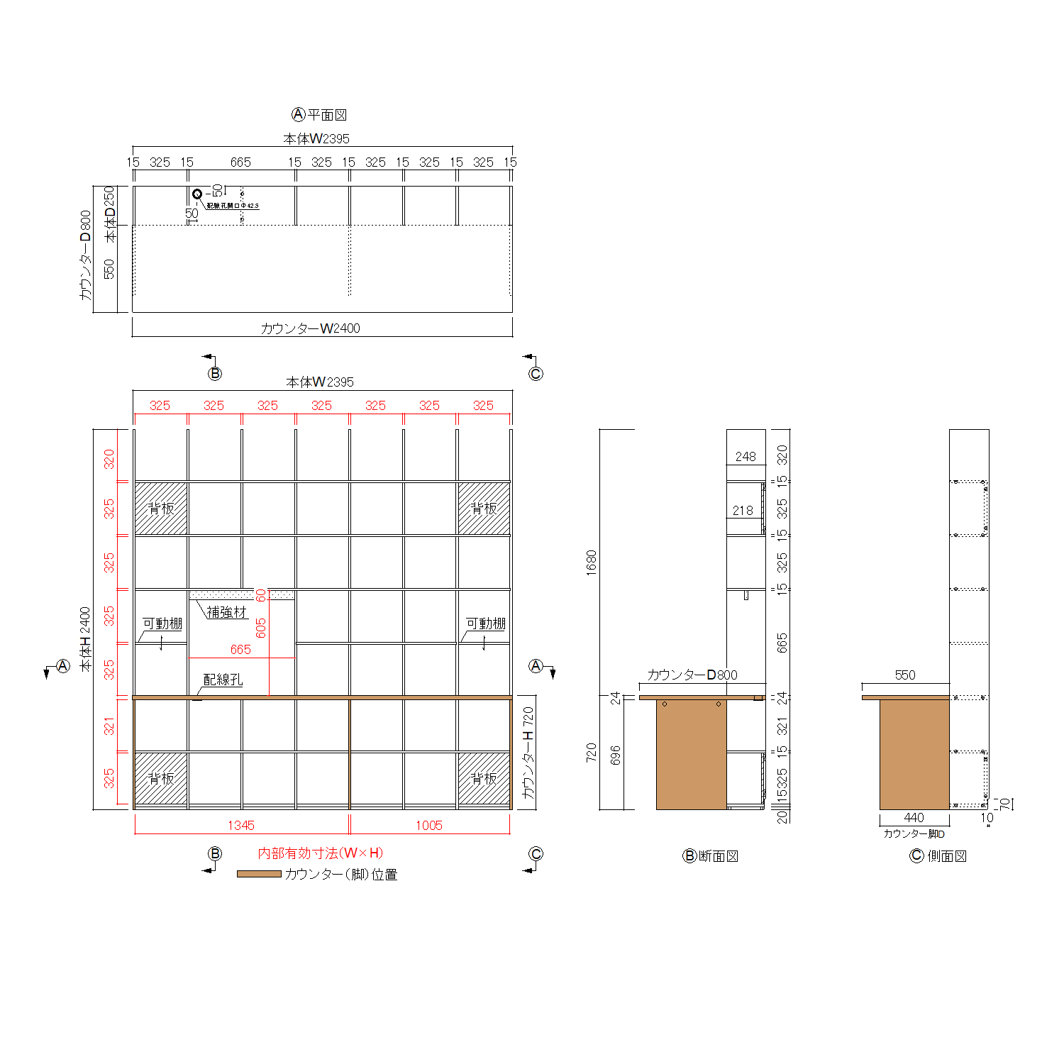 | サイズ | 全体:W2400×H2400×D800 本体:W2395×H2400×D250 カウンター:W2400×D800×T24 |