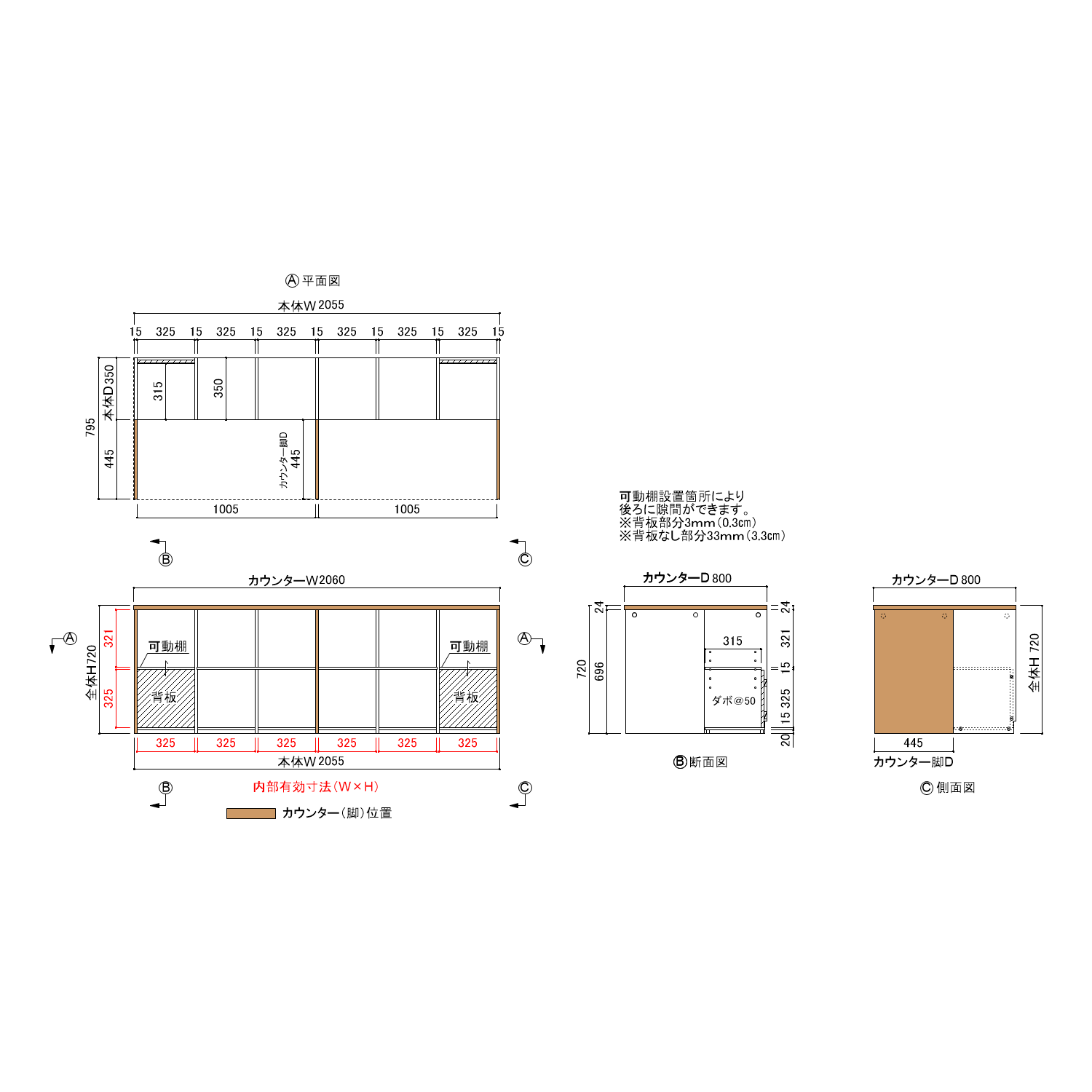 本体:W2055×H696×D350 カウンター天板:W2060×D800×T24 |