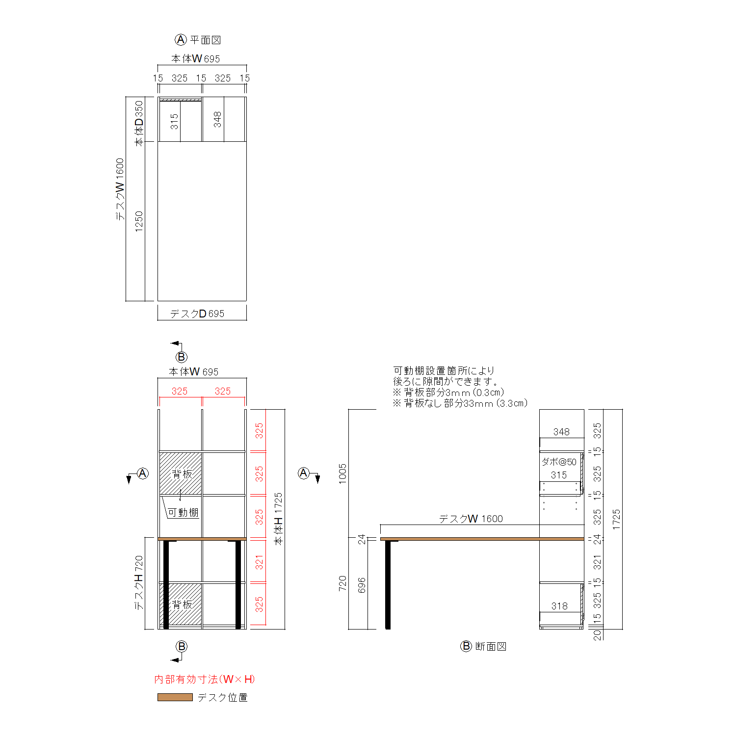 背板部分:D318 可動棚:D315 地板:D338 |