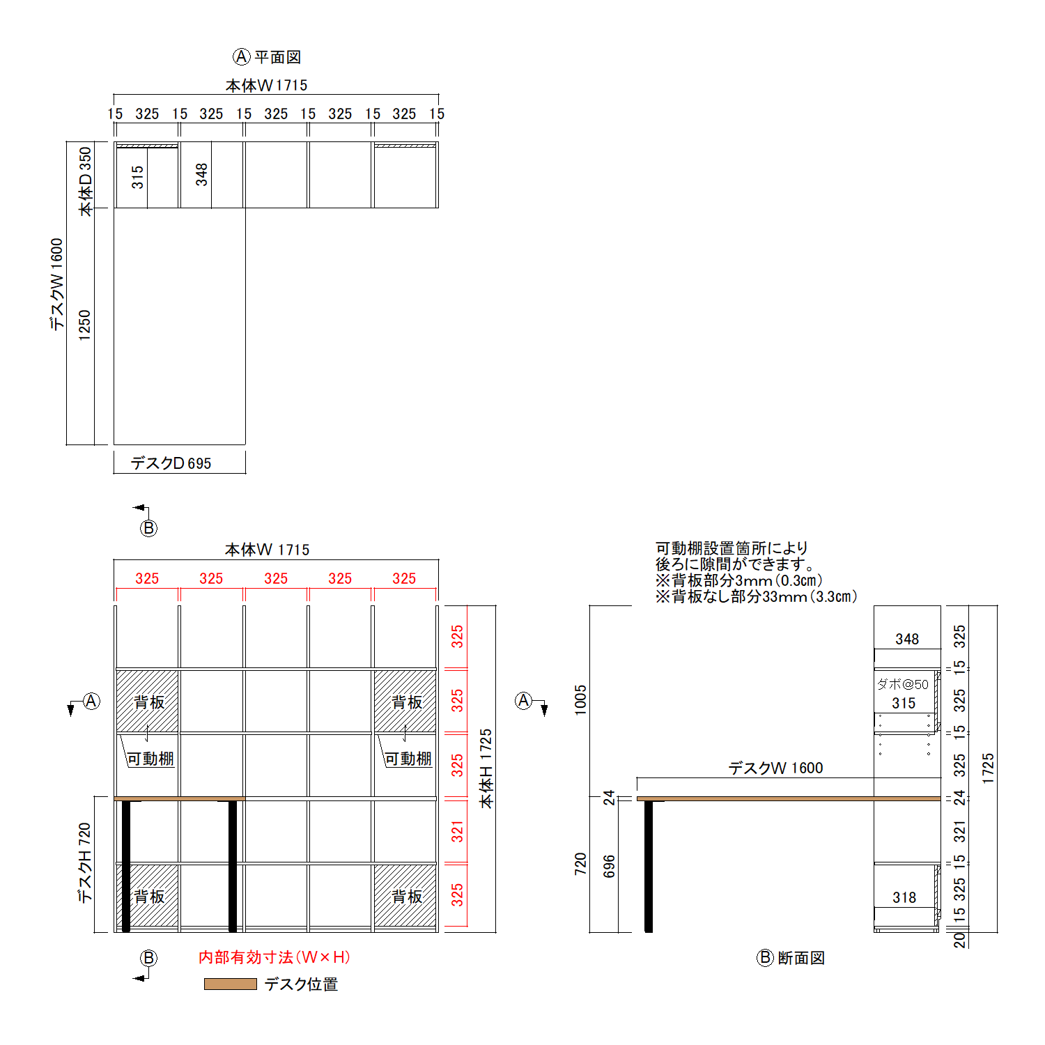 本体:W1715×H1725×D350 テーブル:W1600×D695×T24 |
