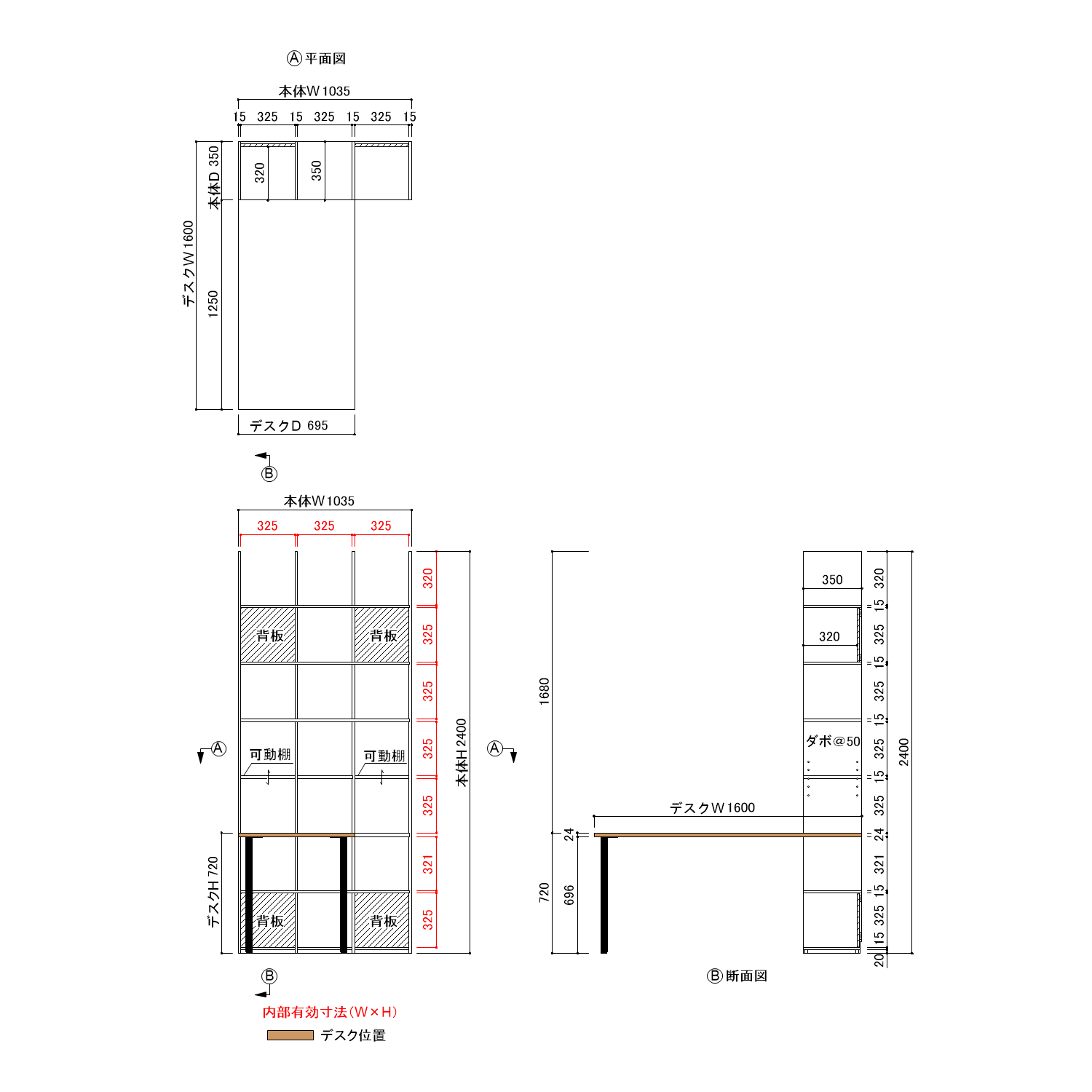 本体:W1035×H2400×D350 テーブル:W1600×D695×T24 |