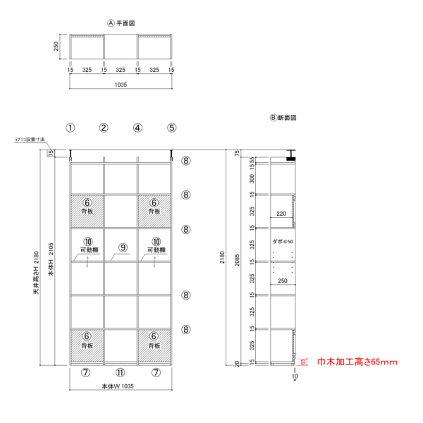 1番上のヨコ板を通常有効H325のところをH300に下げてラブリコが取付出来るように製作