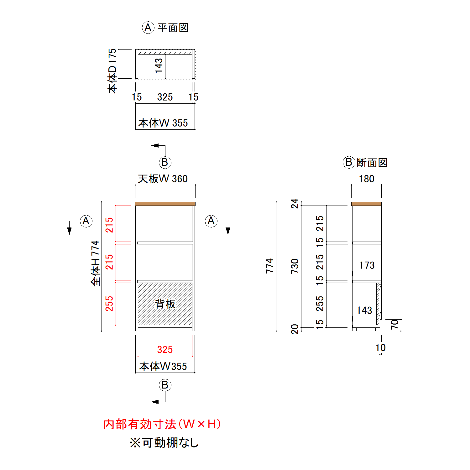 本体:W355×H750×D175 天板:W360×D180×T24 |