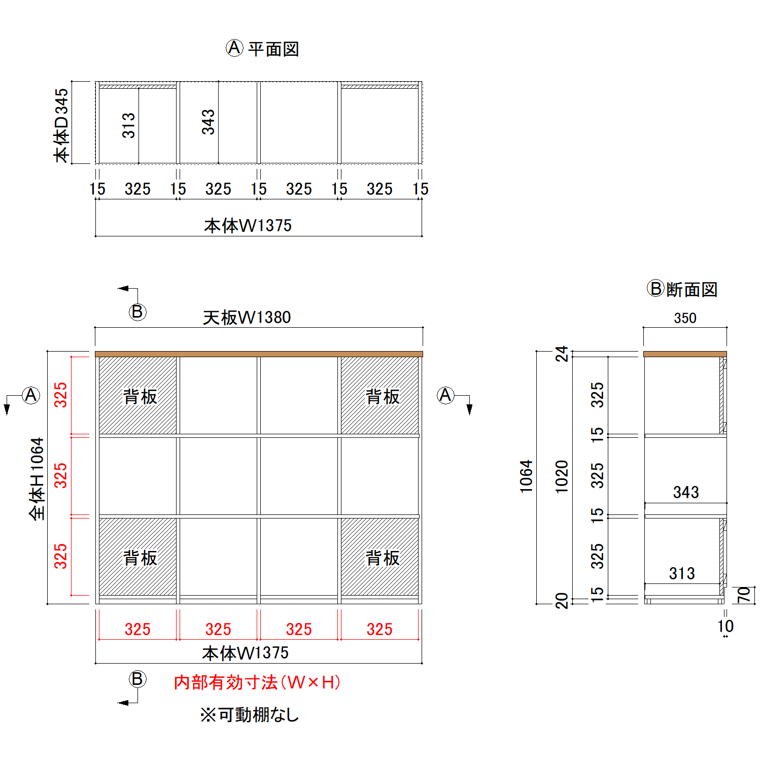 本体:W1375×H1040×D345 天板:W1380×D350×T24 |