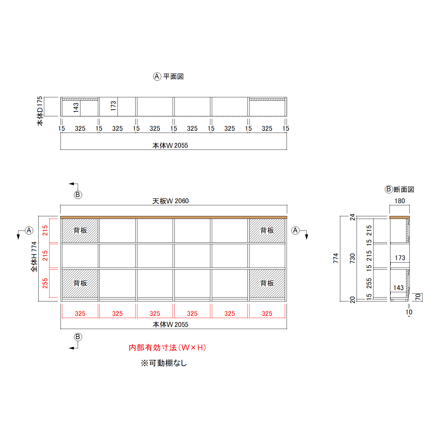 本体:W2055×H750×D175 天板:W2060×D180×T24 |