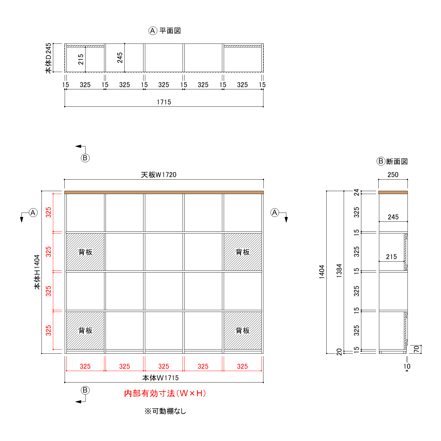 | サイズ | 全体:W1720×H1404×D250 本体:W1715×H1380×D245 天板:W1715×D250×T24 |