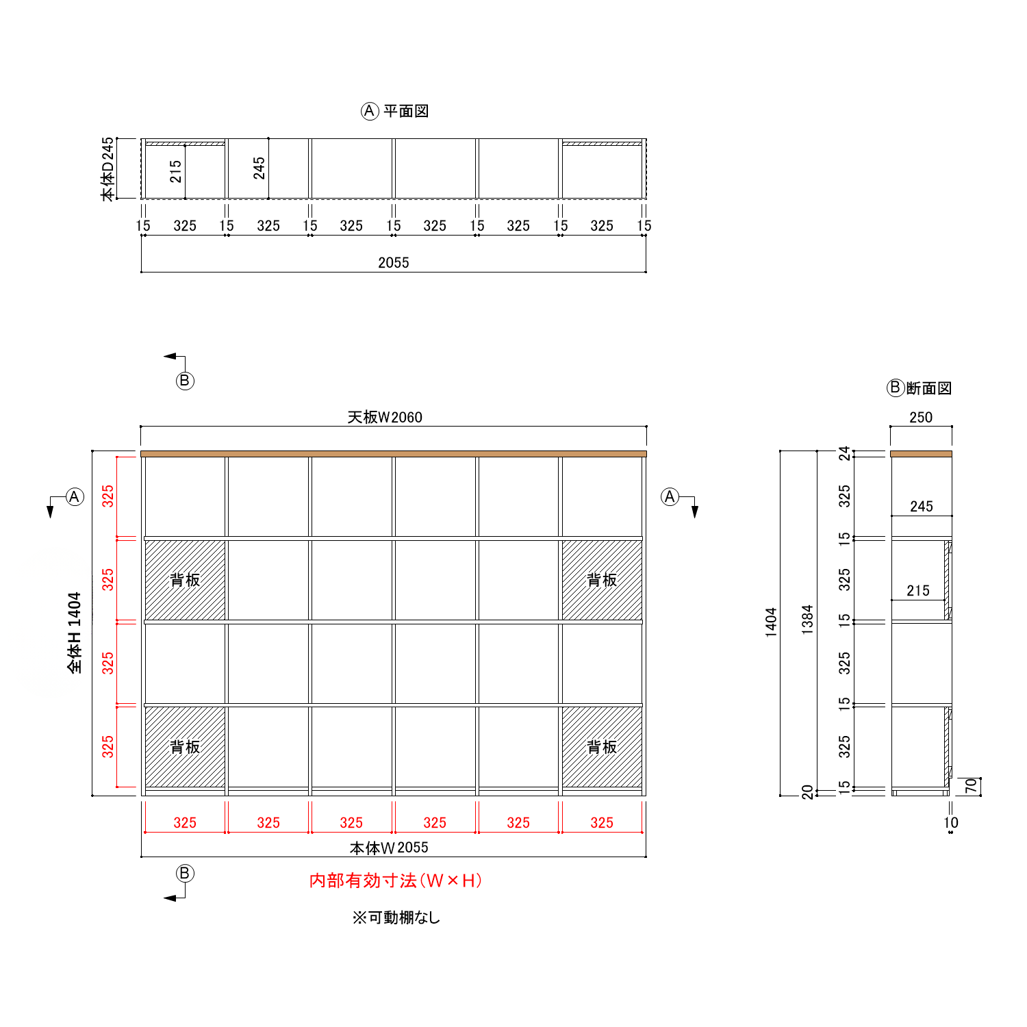 | サイズ | 全体:W2060×H1404×D250 本体:W2055×H1380×D245 天板:W2060×D250×T24 |