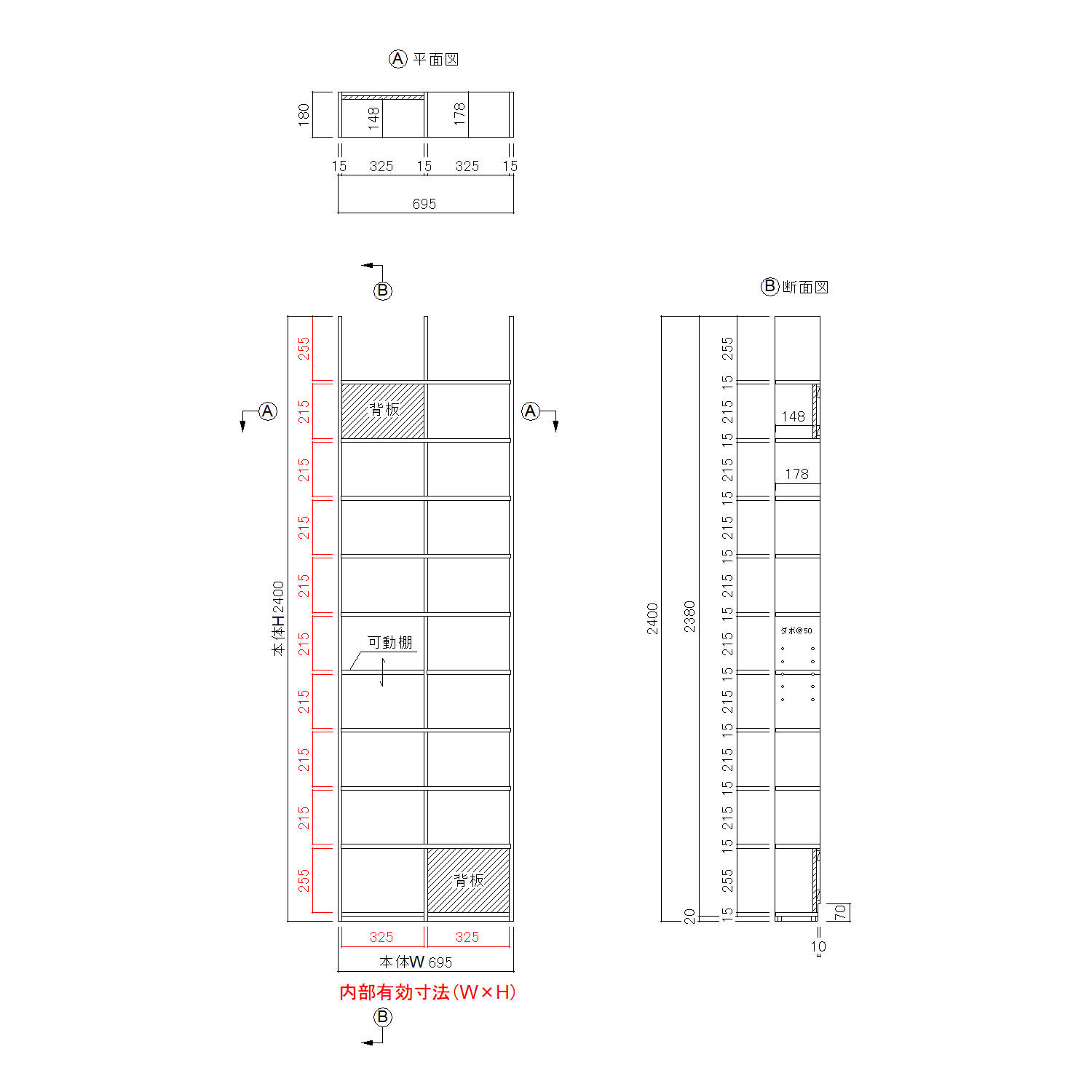 | 開口有効寸法 | 縦・横1マス:W325×H215×D178(下から1・10段目:H255)