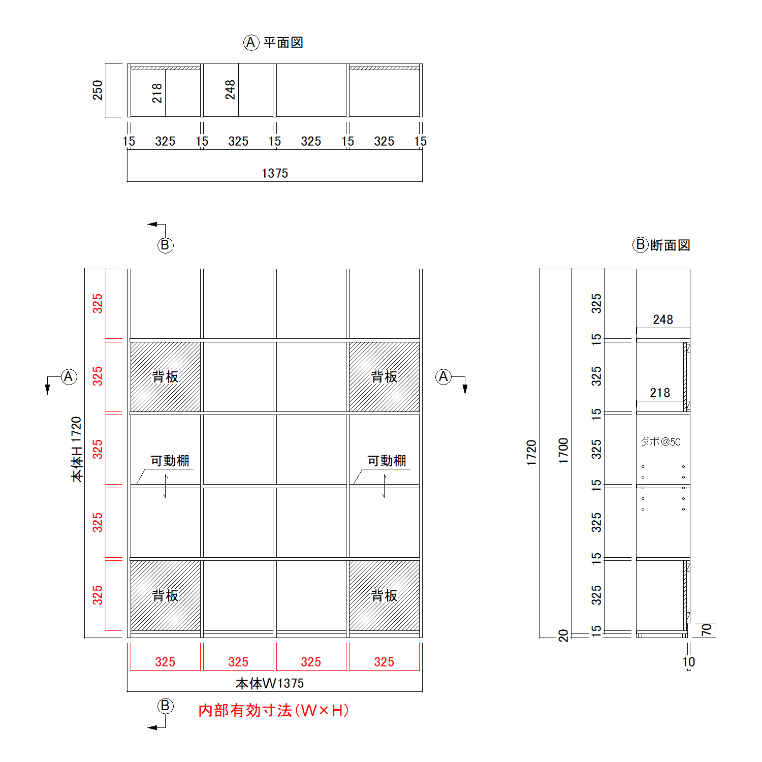 背板部分:D218 可動棚:D248 地板:D238 |