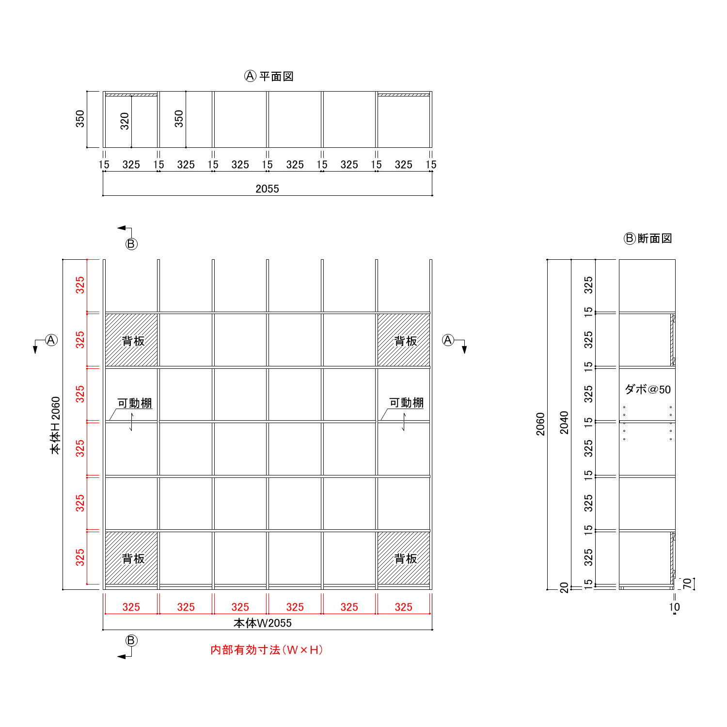 縦・横1マス:W325×H325×D350 背板部分:D320 可動棚:D348 地板:D340 |
