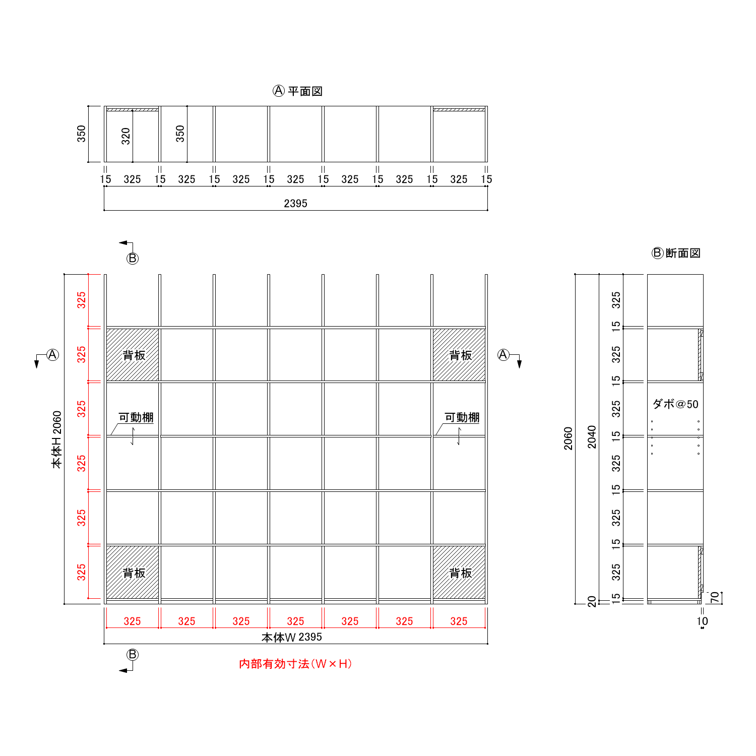 縦・横1マス:W325×H325×D350 背板部分:D320 可動棚:D348 地板:D340 |