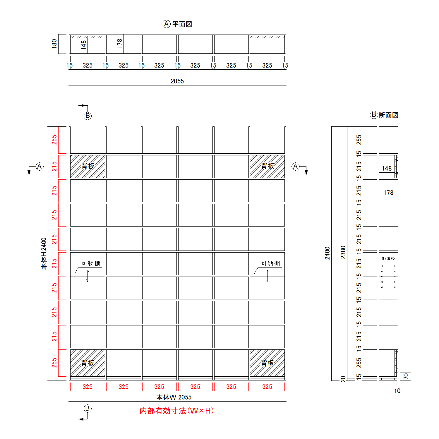 開口有効寸法 縦・横1マス:W325×H215×D178(下から1・7段目:H255)