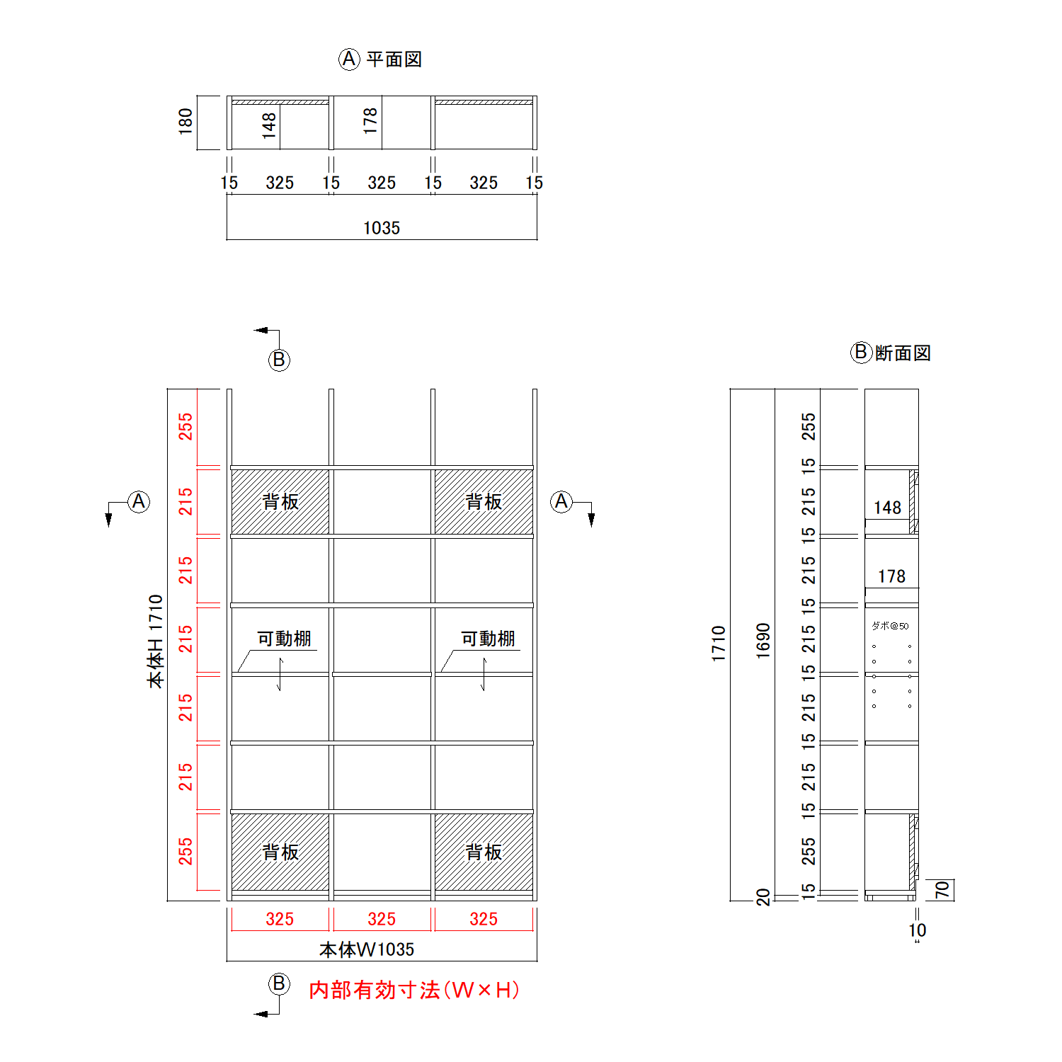| 開口有効寸法 | 縦・横1マス:W325×H215×D178(下から1・7段目:H255)