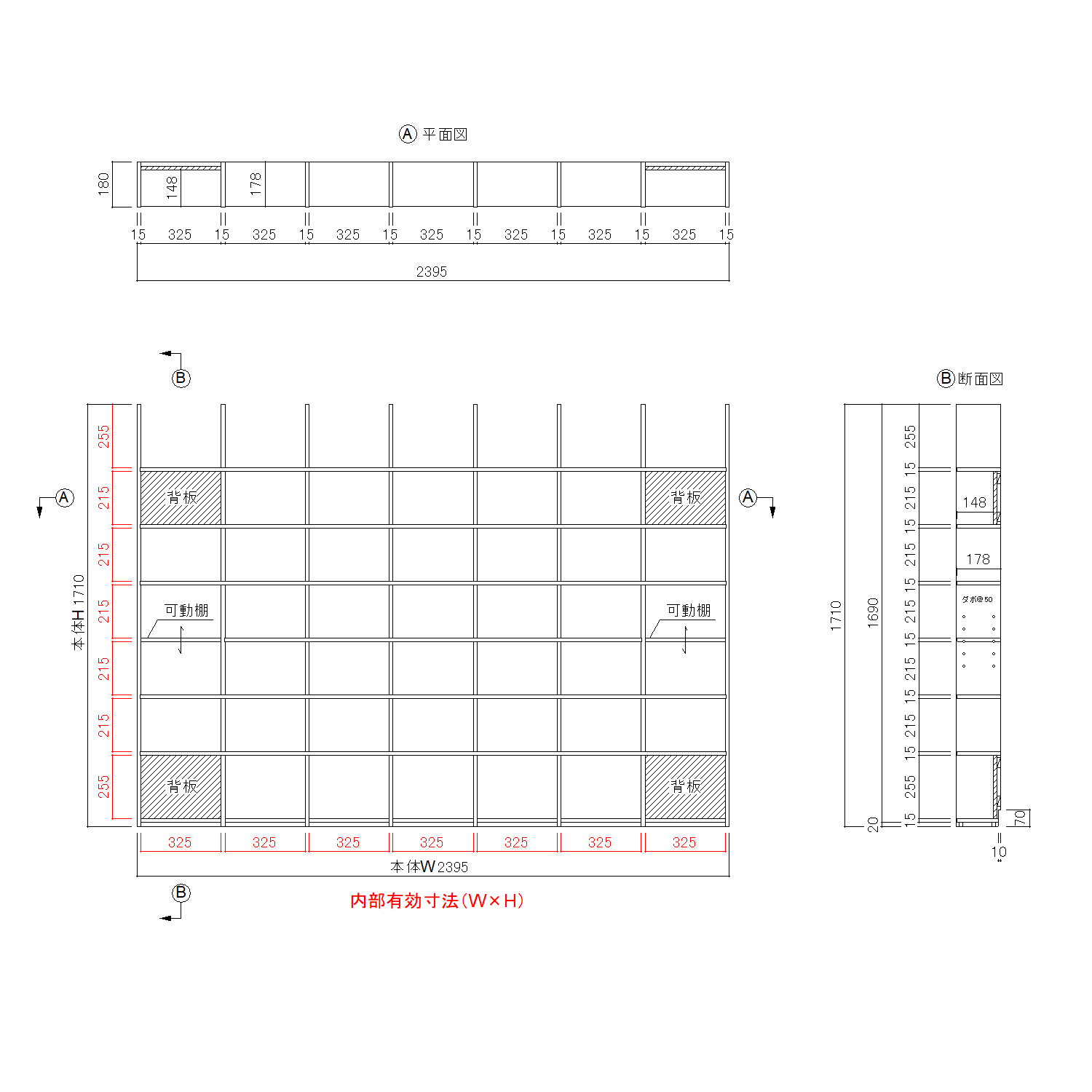 | 開口有効寸法 | 縦・横1マス:W325×H215×D178(下から1・7段目:H255)