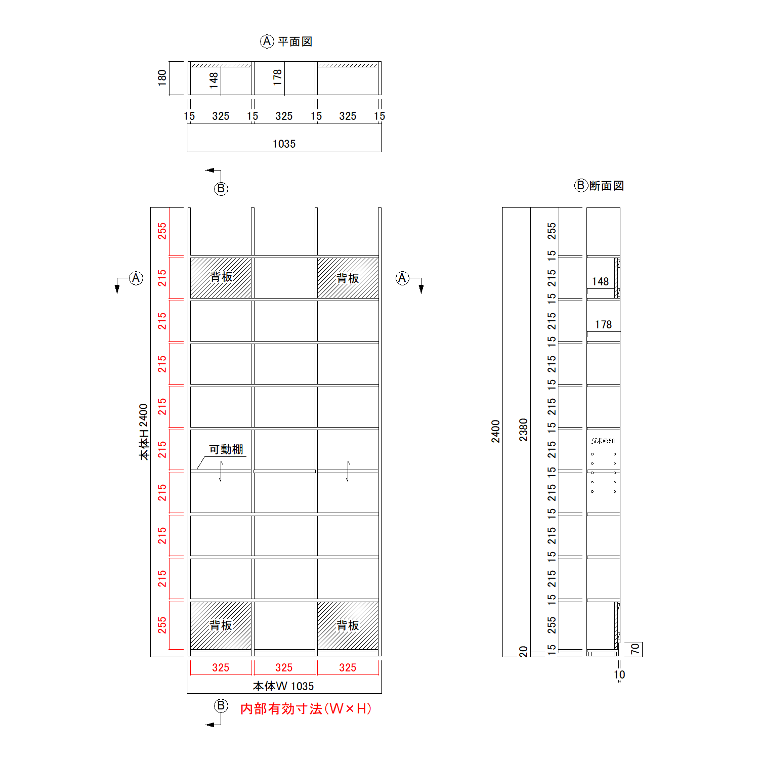 | 開口有効寸法 | 縦・横1マス:W325×H215×D178(下から1・10段目:H255)