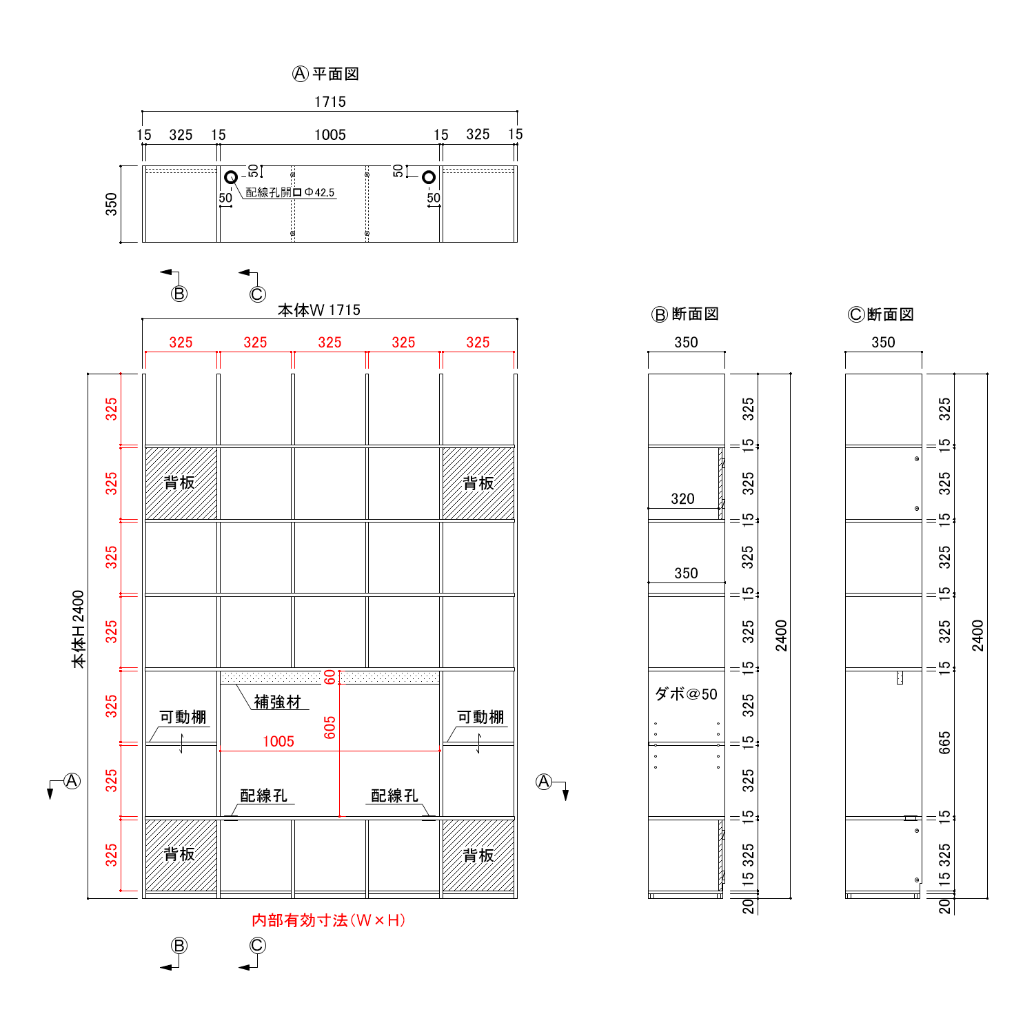 縦2マス×横3マス:W1005×H665/605×D348 縦・横1マス:W325×H325×D348 縦1コマ×横コマ:W665×H325/265×D318/334 背板部分:D318 可動棚:D348 地板:D334 |