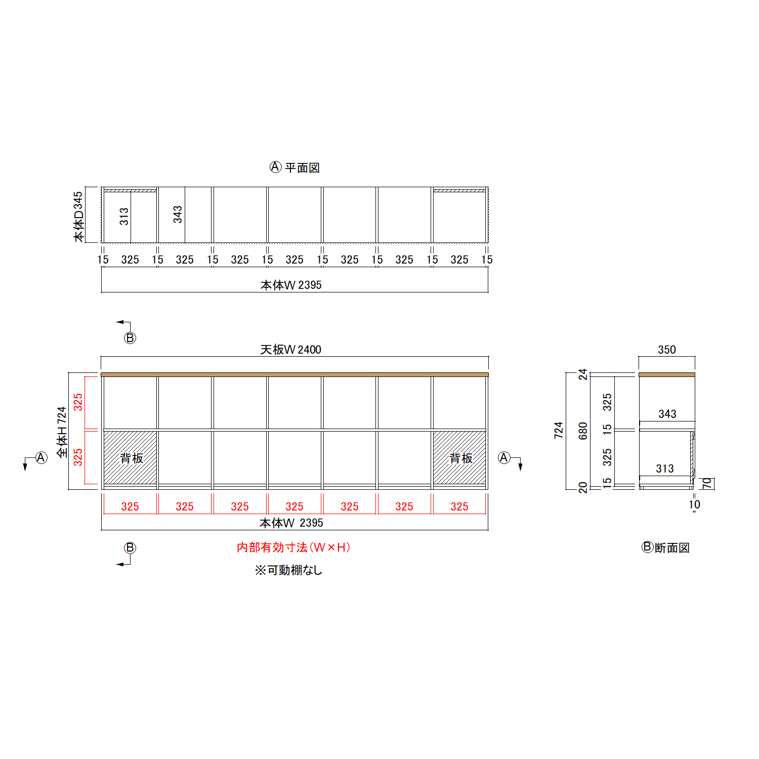 本体:W2395×H700×D345 天板:W2400×D350×T24 |