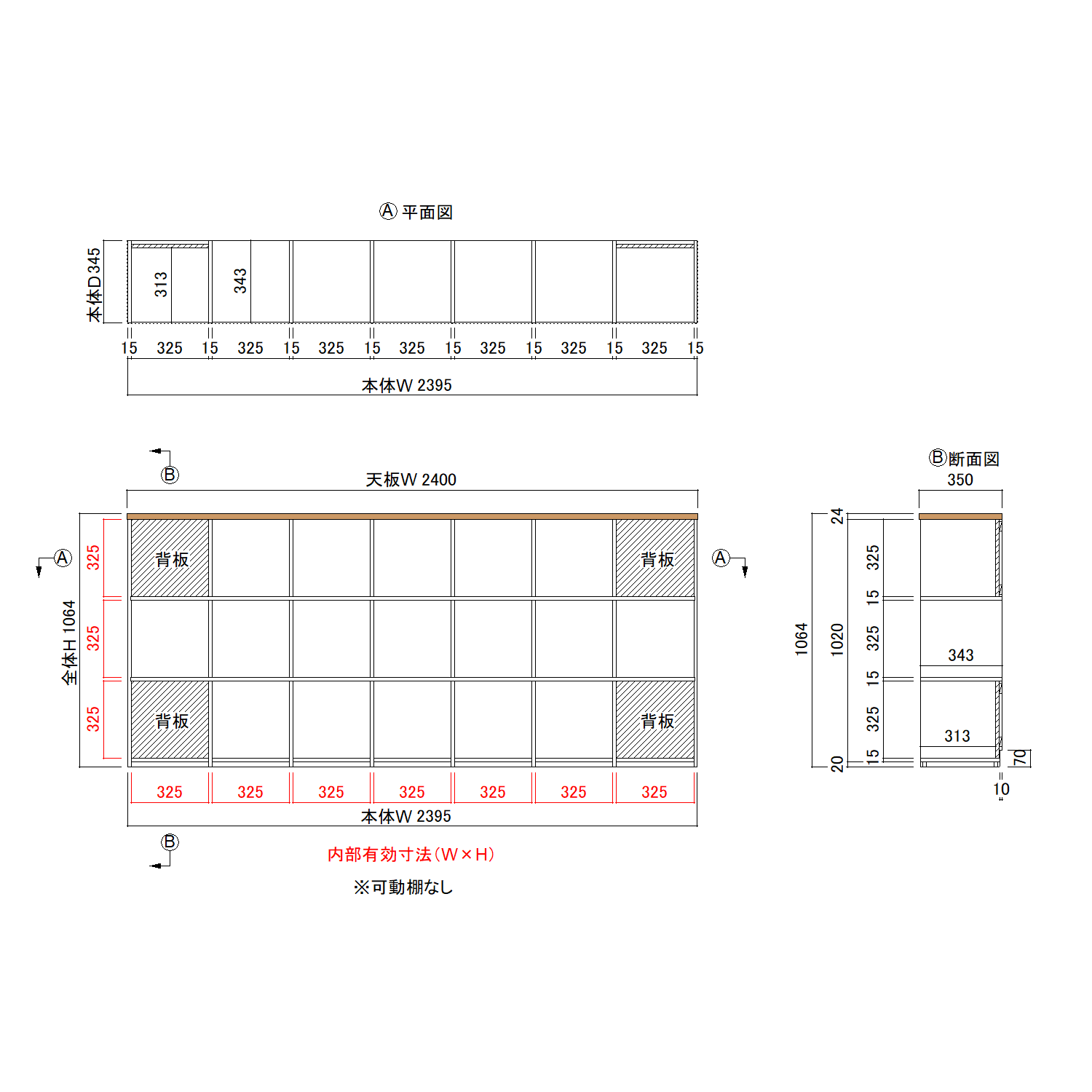 本体:W2395×H1040×D345 天板:W2400×D350×T24 |