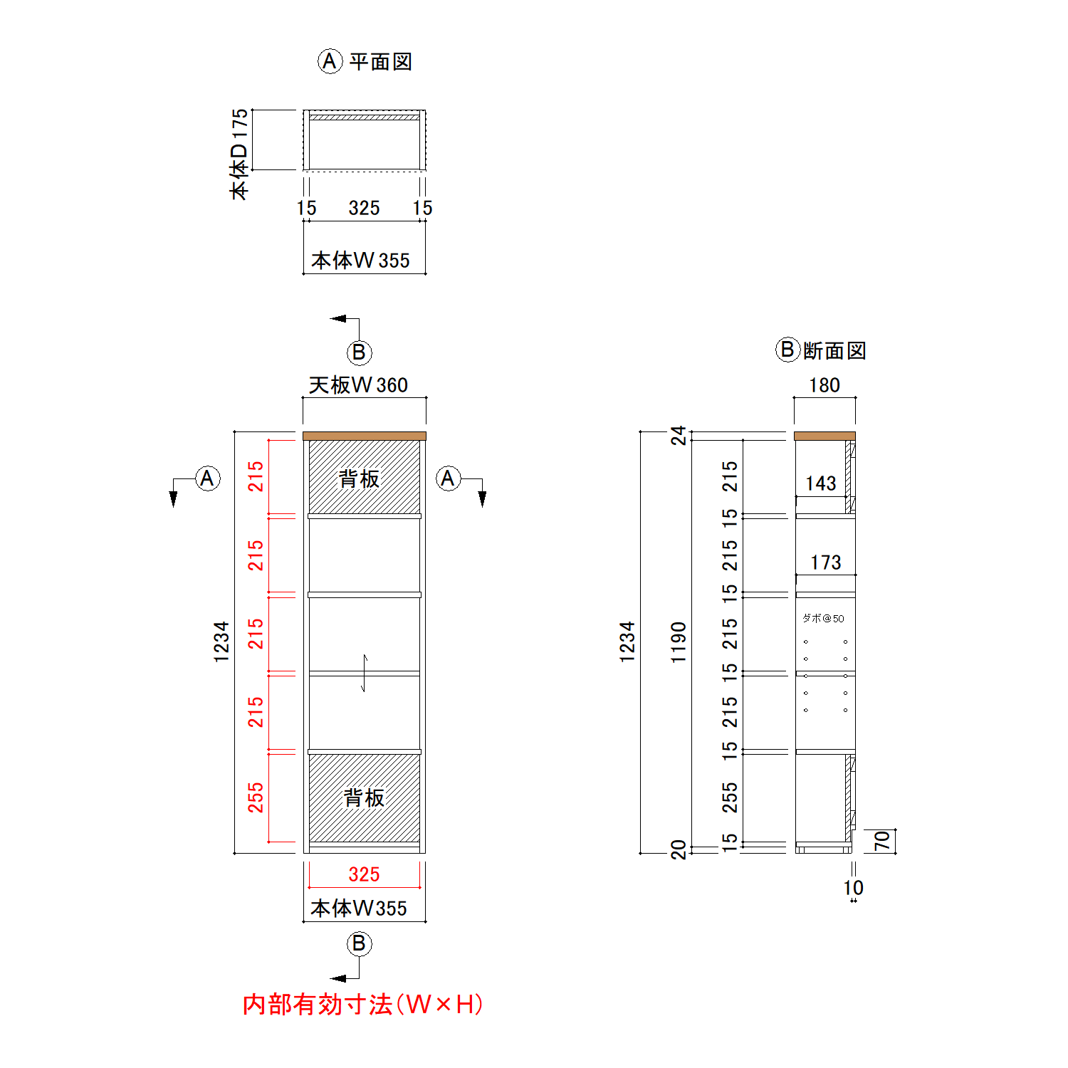 本体:W355×H1210×D175 天板:W360×D180×T24 |