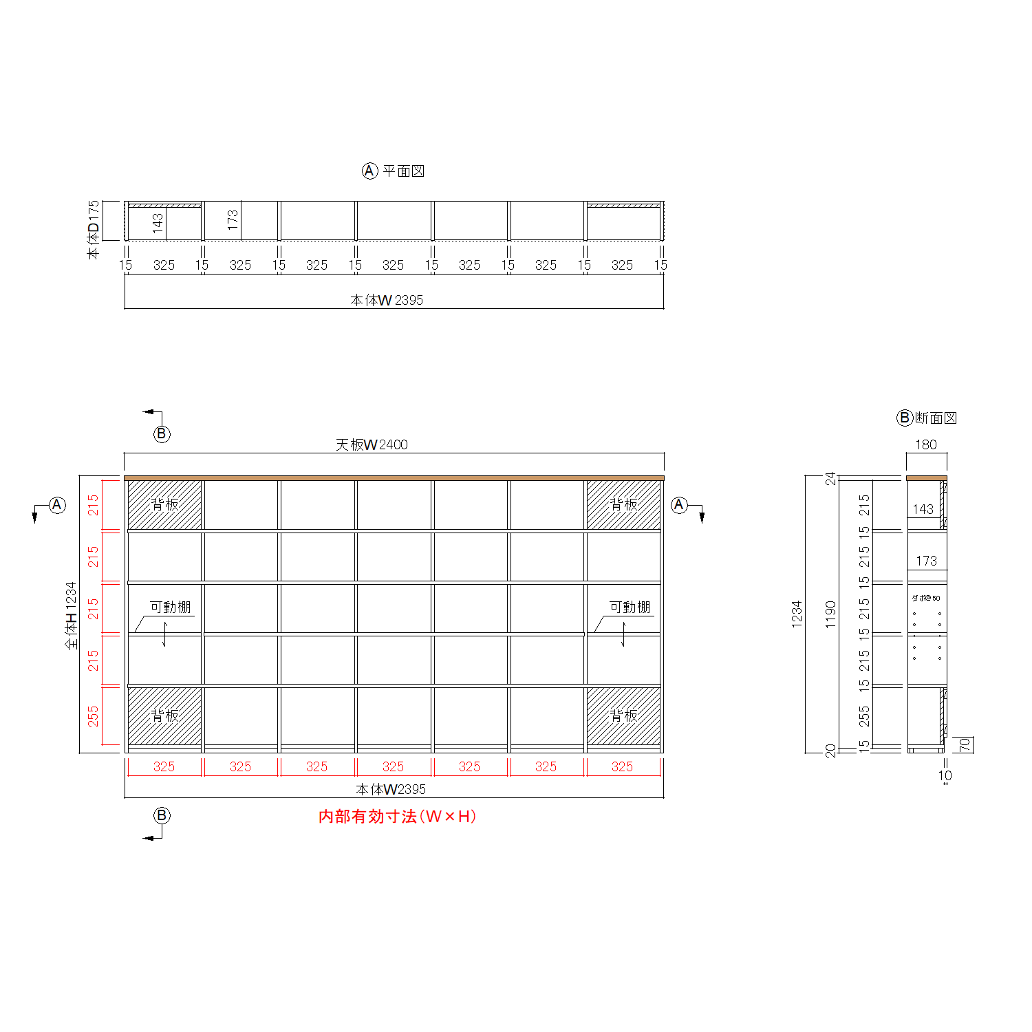 本体:W2395×H1210×D175 天板:W2400×D180×T24 |