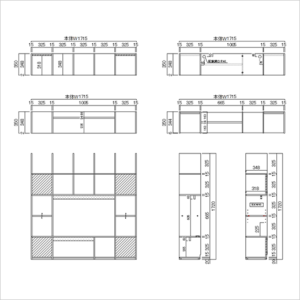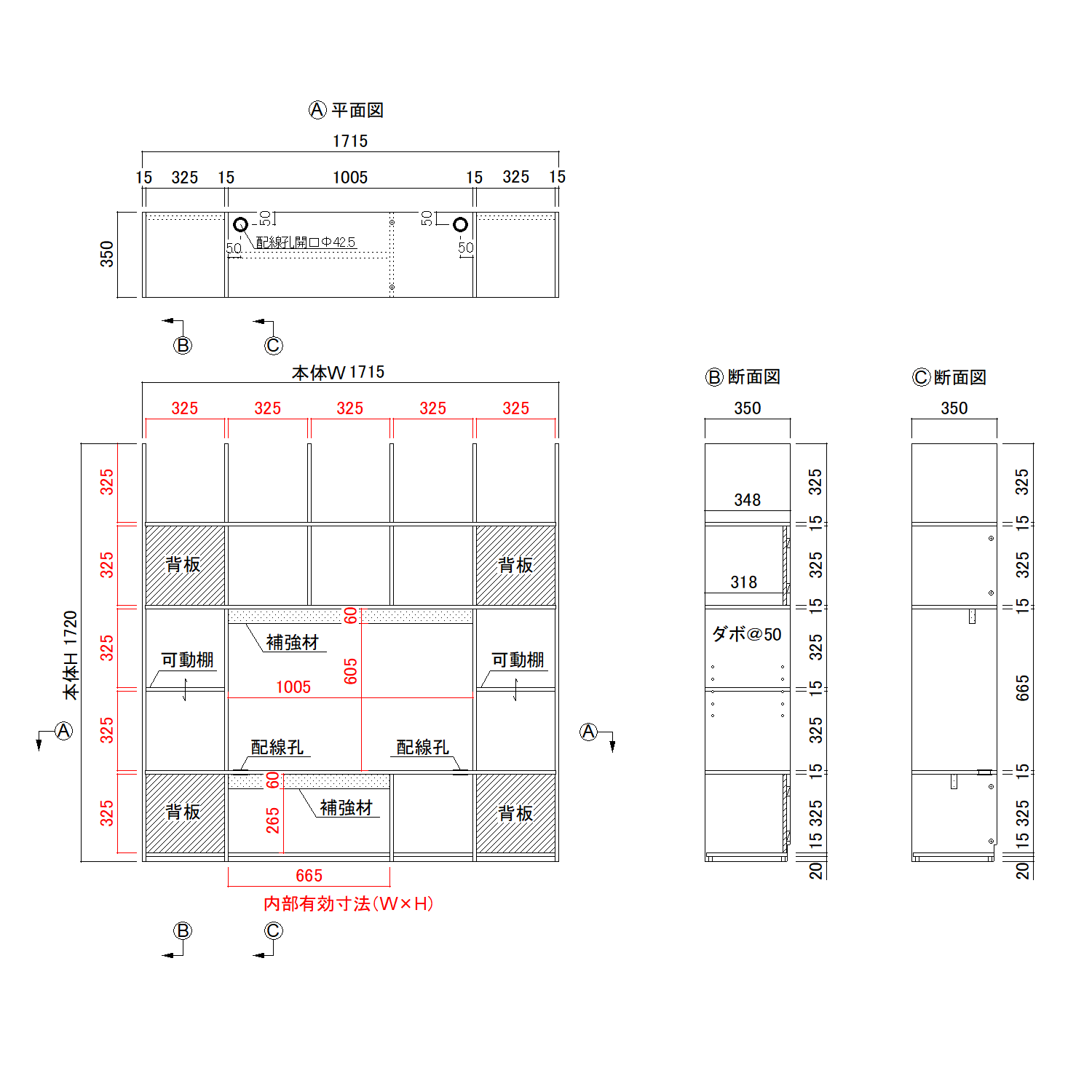 縦・横1マス:W325×H325×D348 縦1コマ×横コマ:W665×H325/265×D318/334 背板部分:D318 可動棚:D348 地板:D334 |