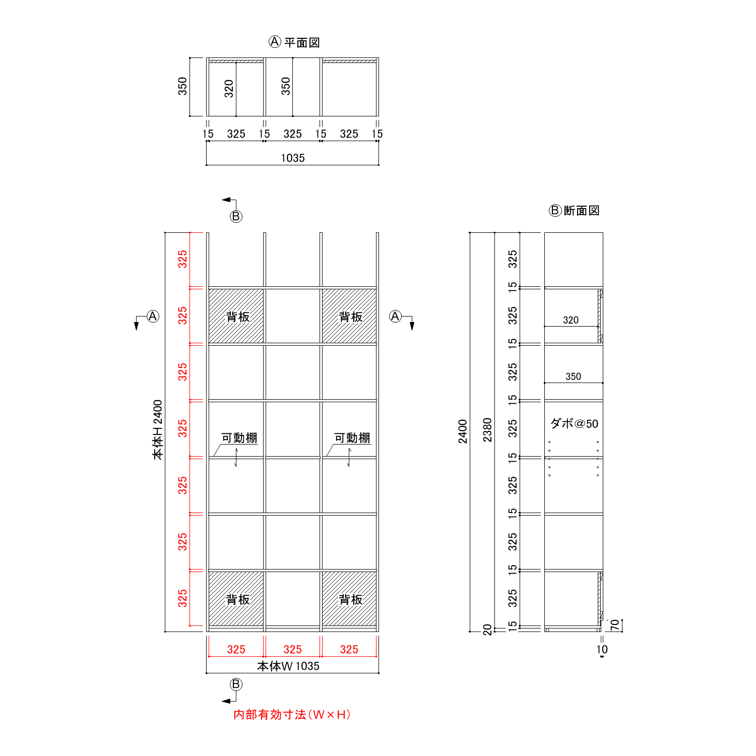 | 開口有効寸法 | 縦・横1マス:W325×H325×D348